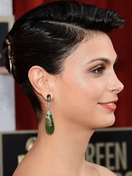 Жгучая брюнетка убрала волосы, открыв шею и сложные серьги с нефритом и россыпью драгоценных камней.
