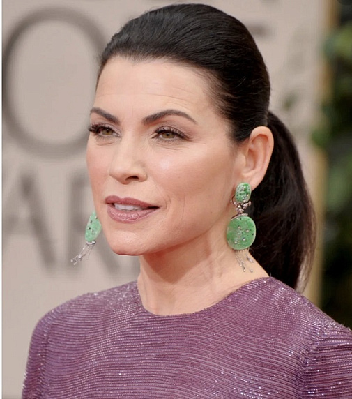 Похожие серьги Джулианна надела на церемонию Золотого Глобуса. Серьги с жадеитом от Lorraine Schwartz имеют более светлый оттенок, чем у Джессики, но такую же сложную резьбу и не менее эффектны.