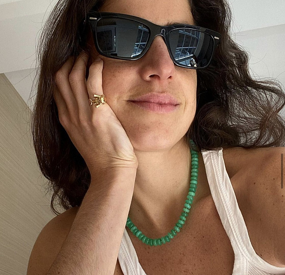 Обратите внимание: чем светлее девушка, тем более нежный оттенок хризопраза она выбирает. А вот брюнетки уже носят насыщенные цвета. Конни поступает так же: ее серьги- бусинки от… Irene Neuwirth, конечно же, достаточно светлые.
