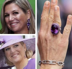 Аметист - один из любимых камней Максимы. Изящные удлиненные серьги, или крупное коктейльное кольцо- фиолетовый минерал часто видят на королеве.