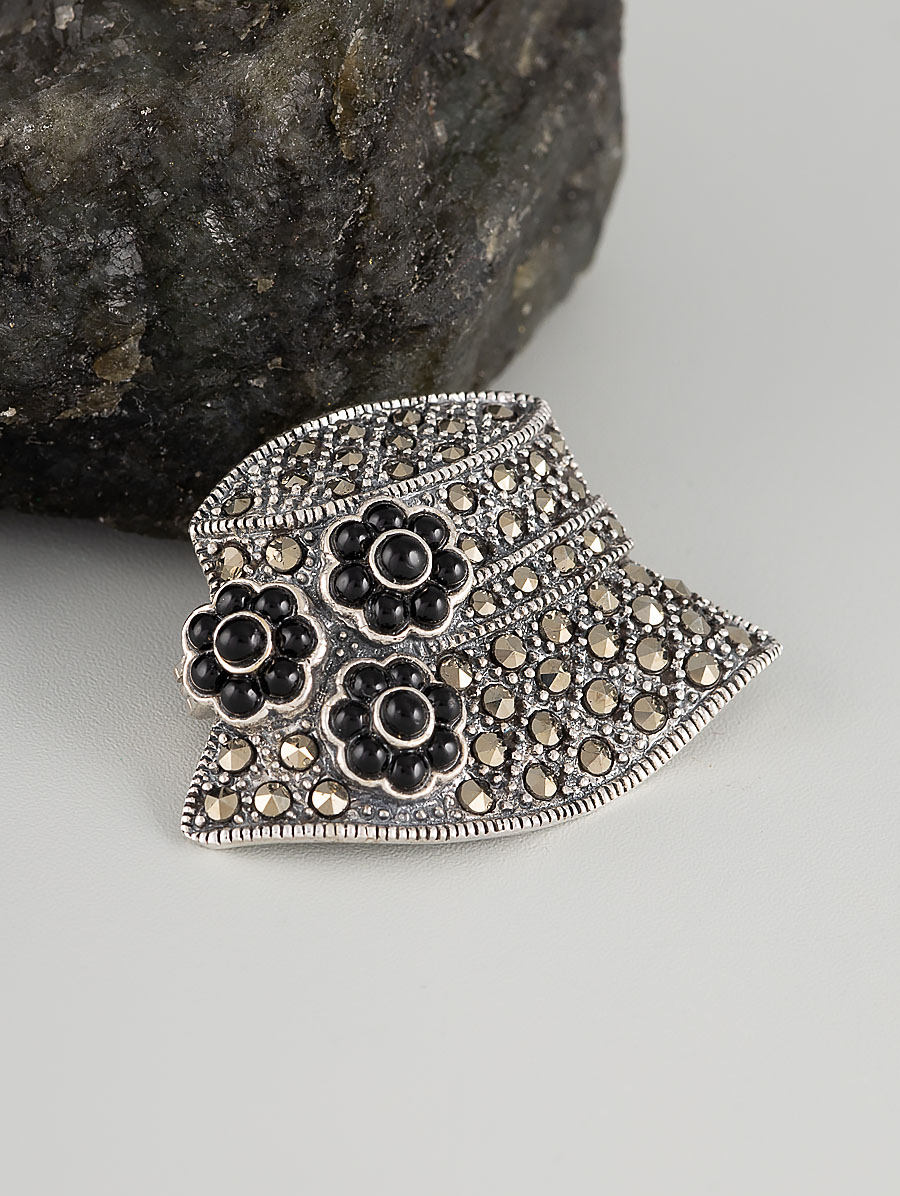 Брошь из серебра с марказитом, ониксом