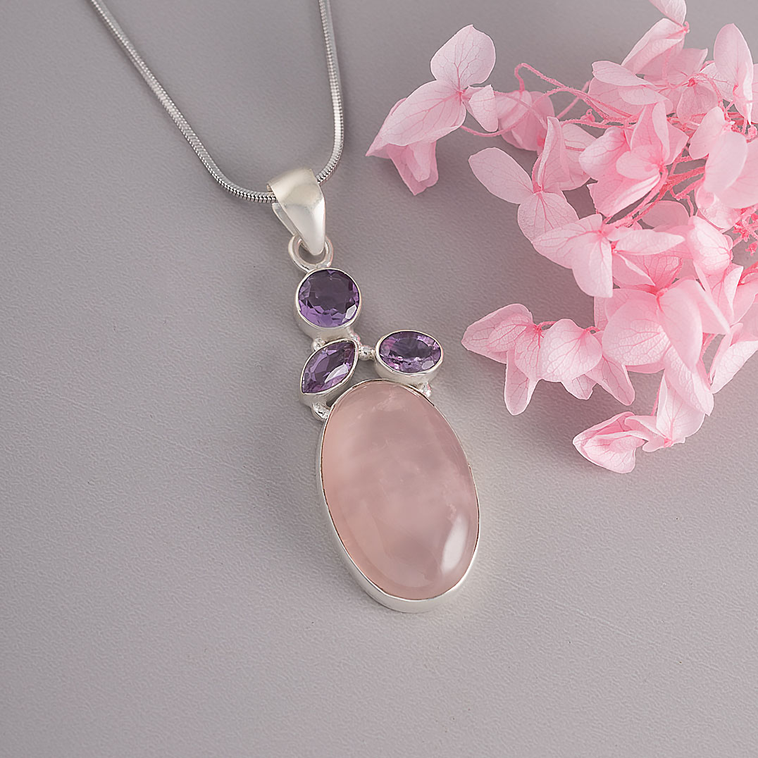 Кулон из серебра с аметистом, розовым кварцем