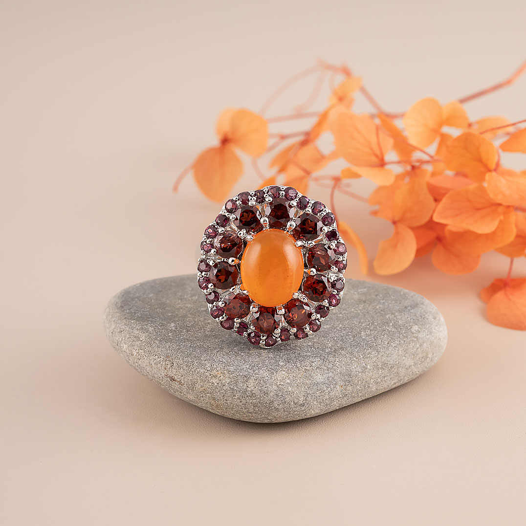 Кольцо из серебра с гранатом, родолитом, солнечным камнем