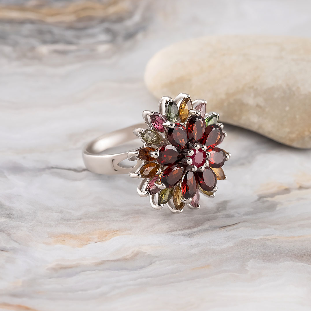 Кольцо из серебра с гранатом, рубином, турмалином