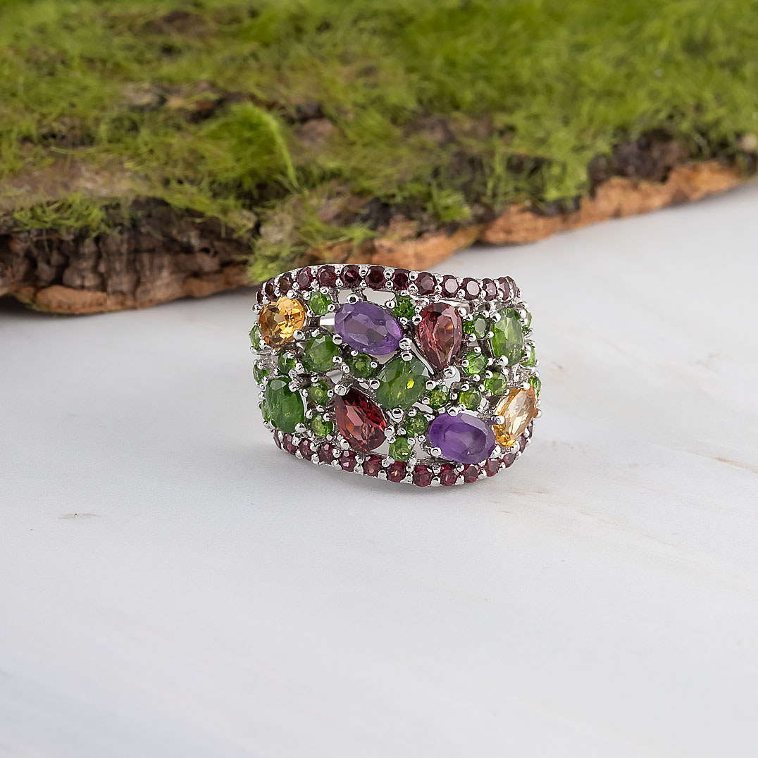 Кольцо из серебра с цитрином, гранатом, аметистом, хромдиопсидом