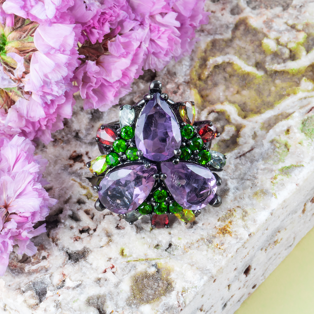 Кольцо из серебра с аметистом, хромдиопсидом