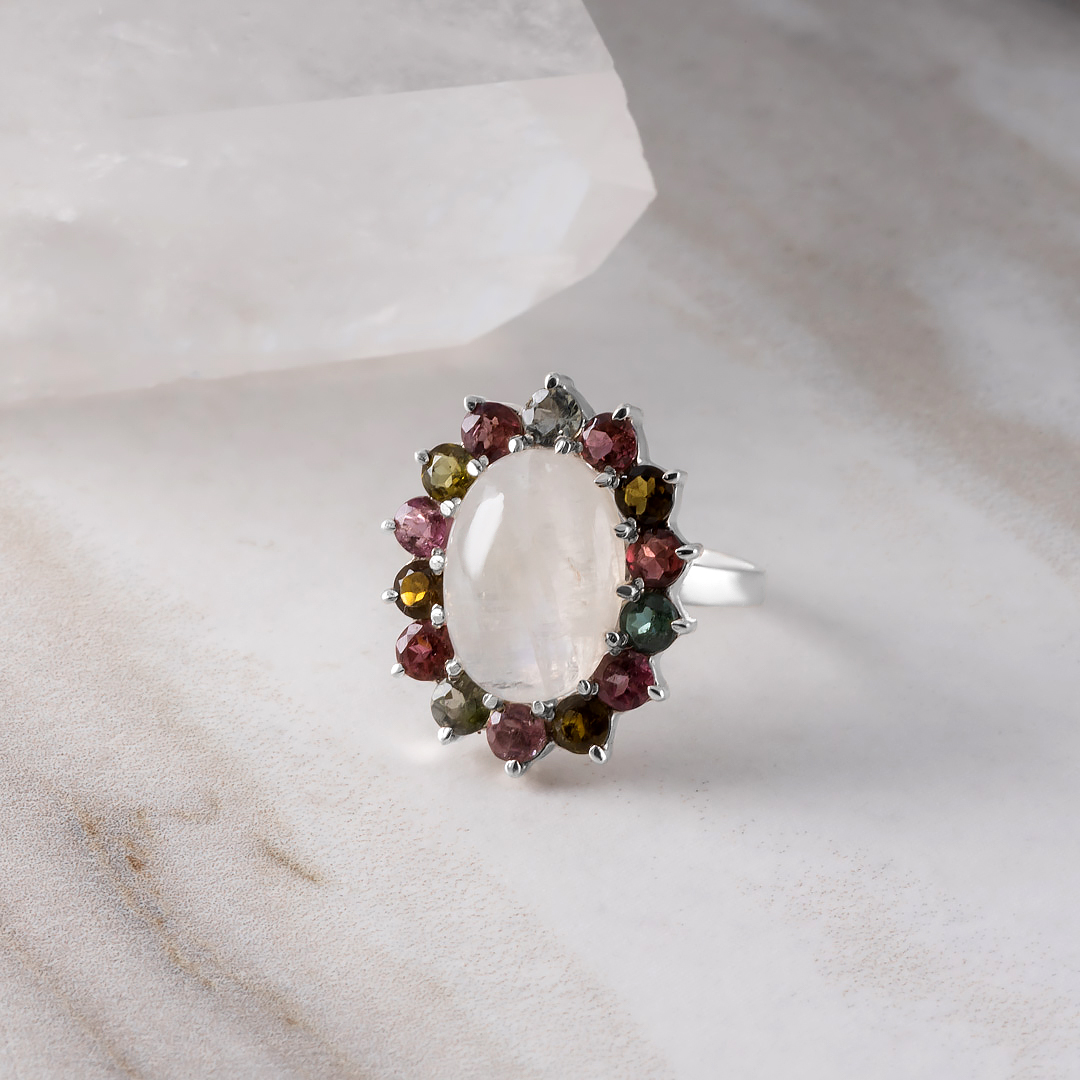 Кольцо из серебра с лунным камнем, турмалином