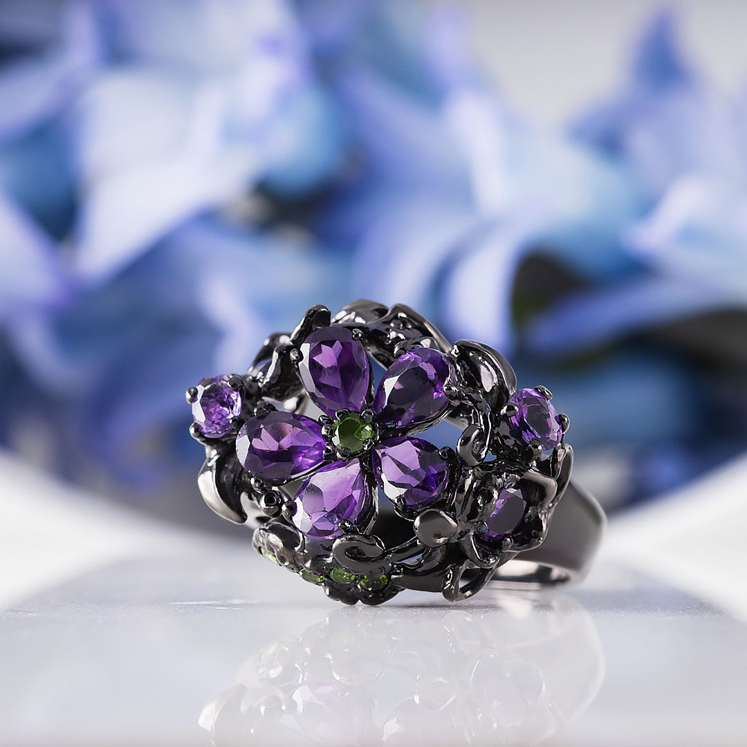 Кольцо из серебра с аметистом, хромдиопсидом