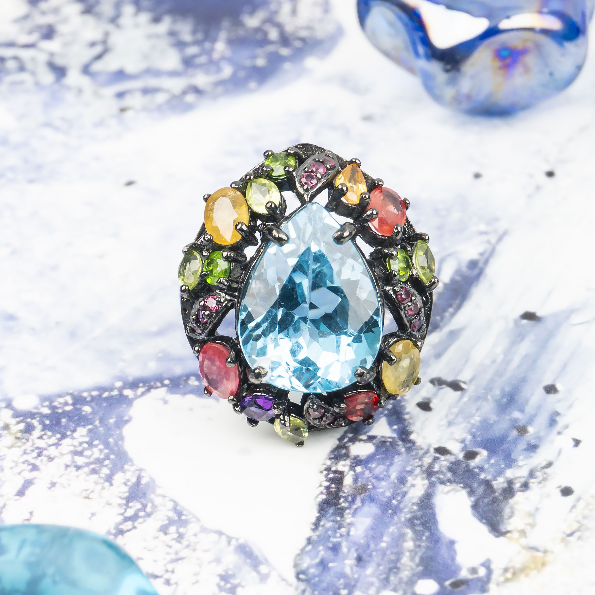 Топаз - один из самых популярных драгоценных камней в ювелирном искусстве. По твердости он уступает только алмазу и корунду. Прозрачность и бриллиантовый блеск граней делают его удивительно привлекательным для коллекционеров. Название камень получил в честь острова Топазос в Красном море. Люди знали этот камень еще в древние времена. Так, Библия гласит, что топаз составлял часть украшения первосвященника Аарона. Королевские дворы Европы также выбирали этот камень для ювелирных коллекций. Известен, например, камень “Браганза“, входящий в число регалий португальской короны. Цветовая гамма этого драгоценного камня разнообразна: существуют розовые, желтые, голубые, фиолетовые, винные топазы. Голубые топазы принято разделять на три категории в зависимости от интенсивности окраски (обычно достигаемой за счет облучения): Sky Blue - небесно-голубые, Swiss Blue - швейцарские, с более насыщенным цветом, и London Blue - лондонские, с наиболее глубоким оттенком синевы.