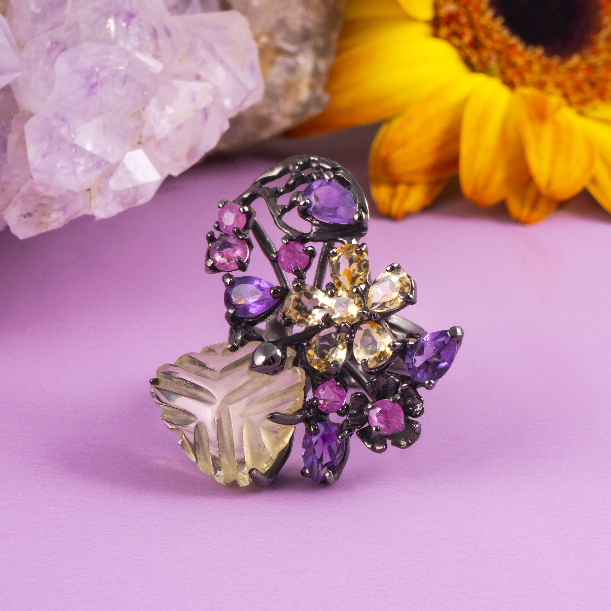 Кольцо из серебра с цитрином, рубином, кварцем, аметистом