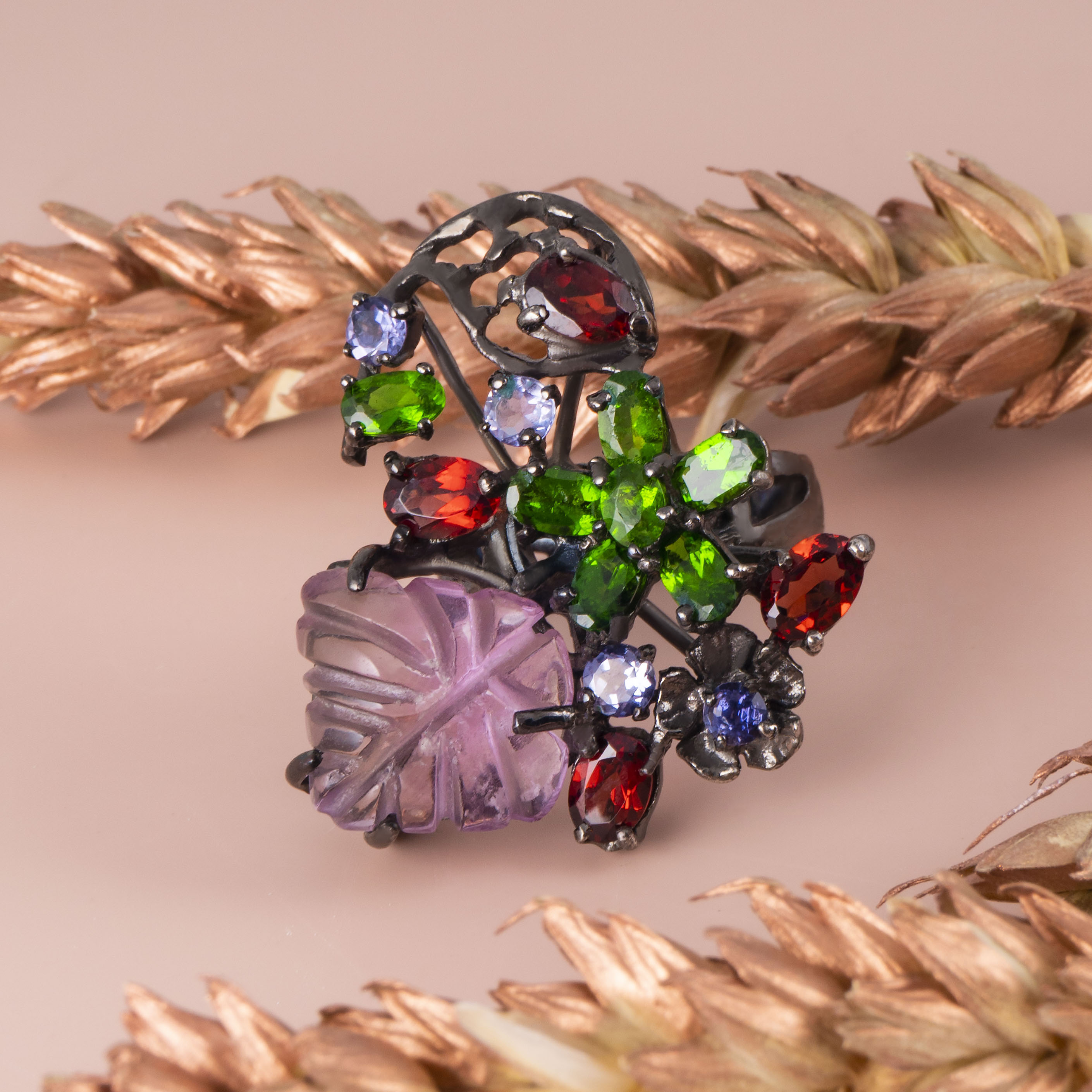 Кольцо из серебра с гранатом, аметистом, хромдиопсидом, танзанитом