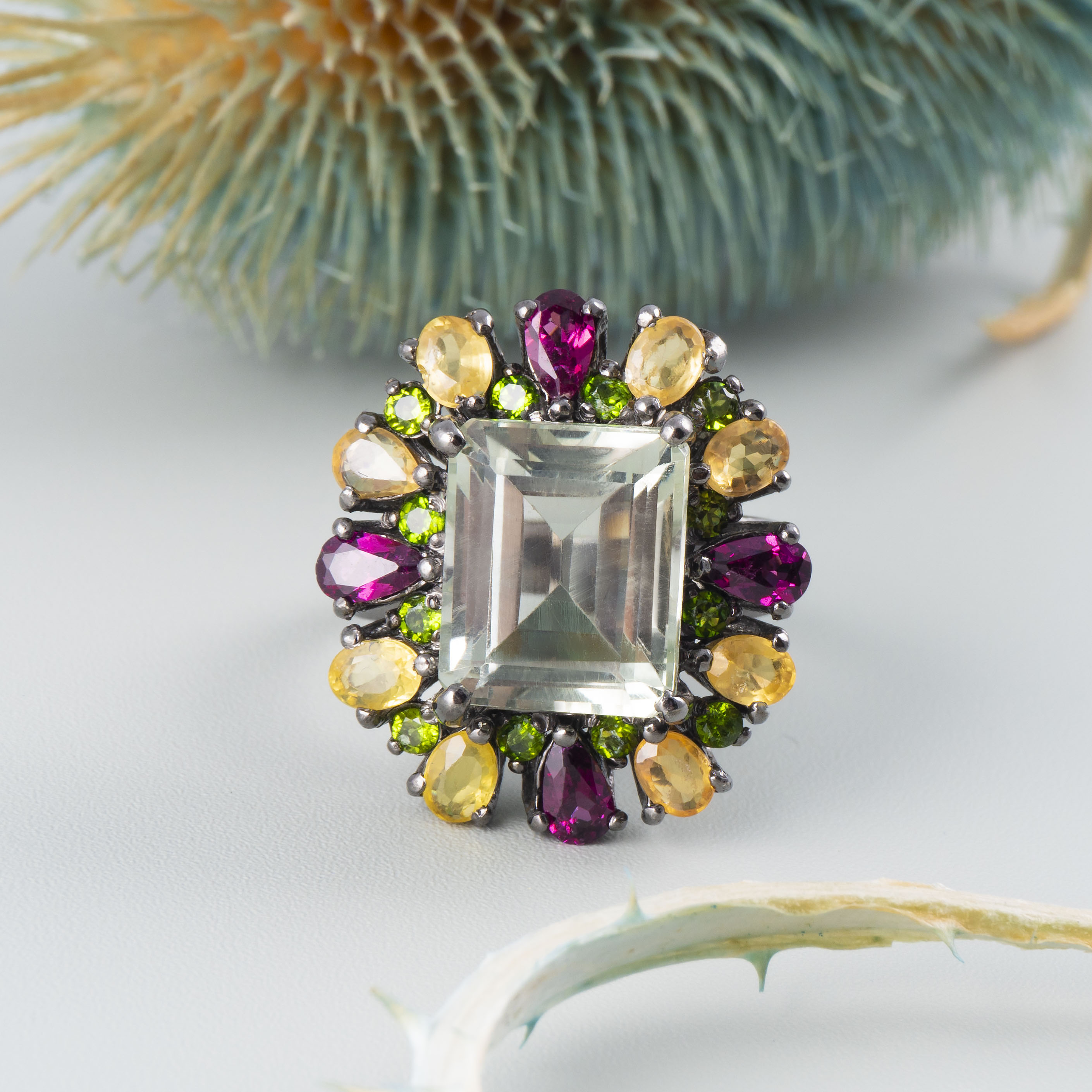 Кольцо из серебра с празиолитом, сапфиром, родолитом, хромдиопсидом