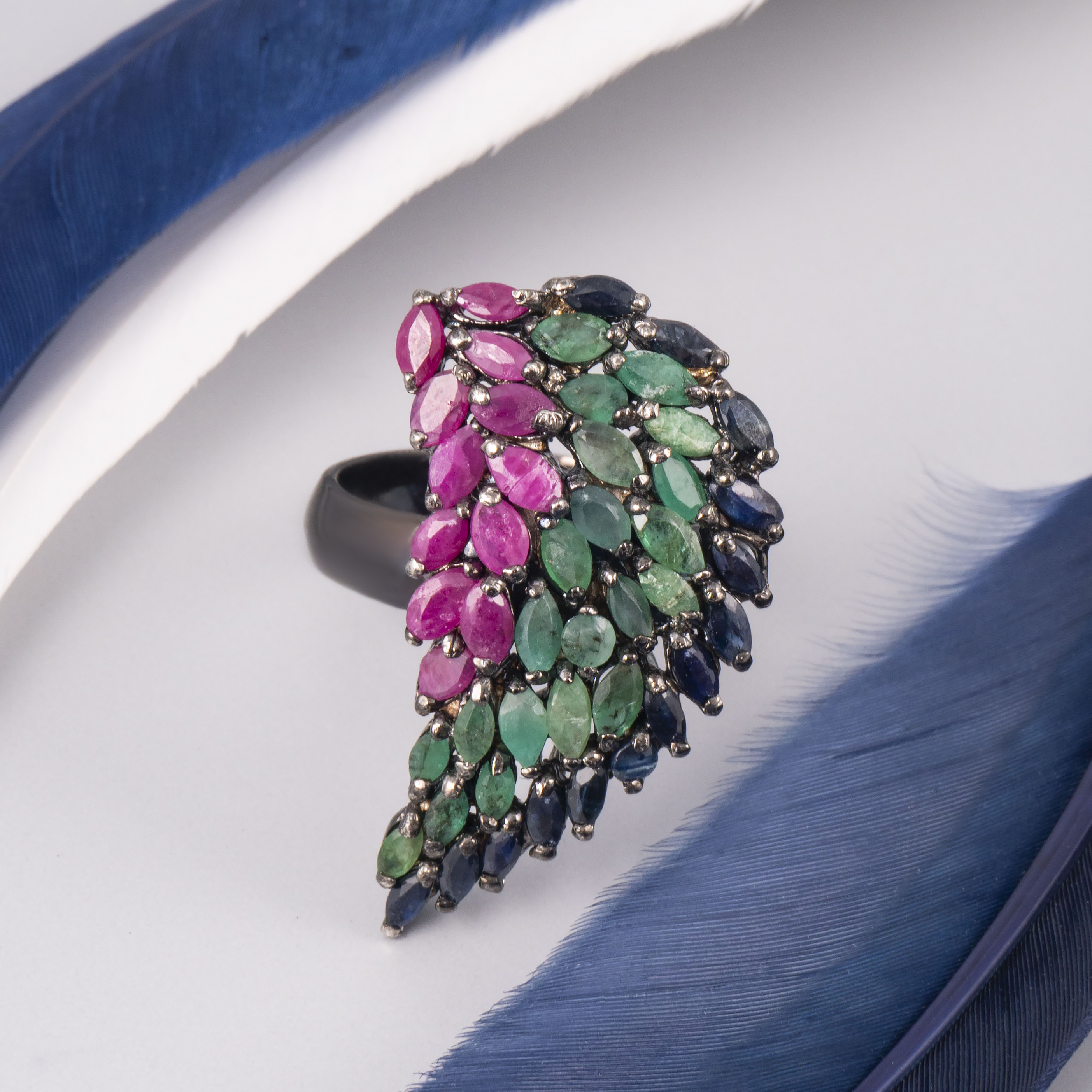 Кольцо из серебра с изумрудом, рубином, сапфиром