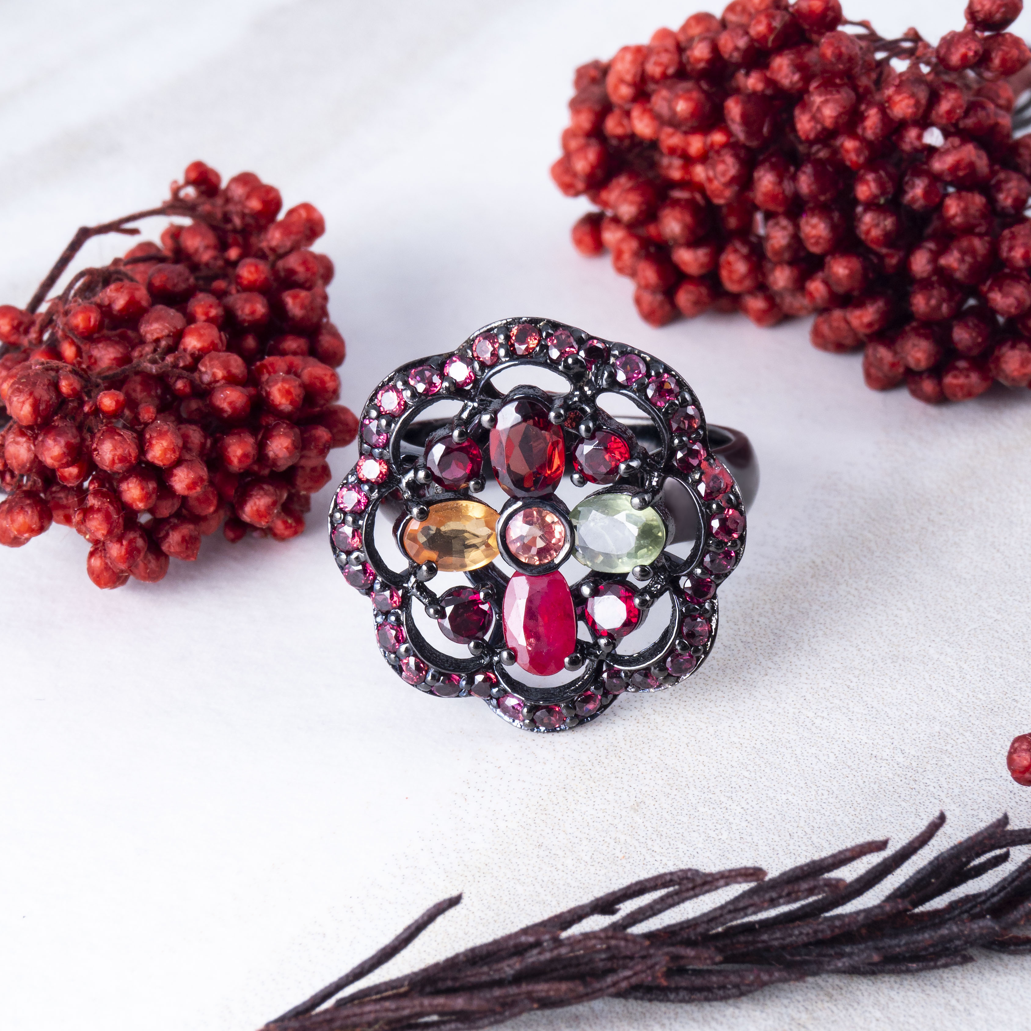 Кольцо из серебра с родолитом, гранатом, сапфиром