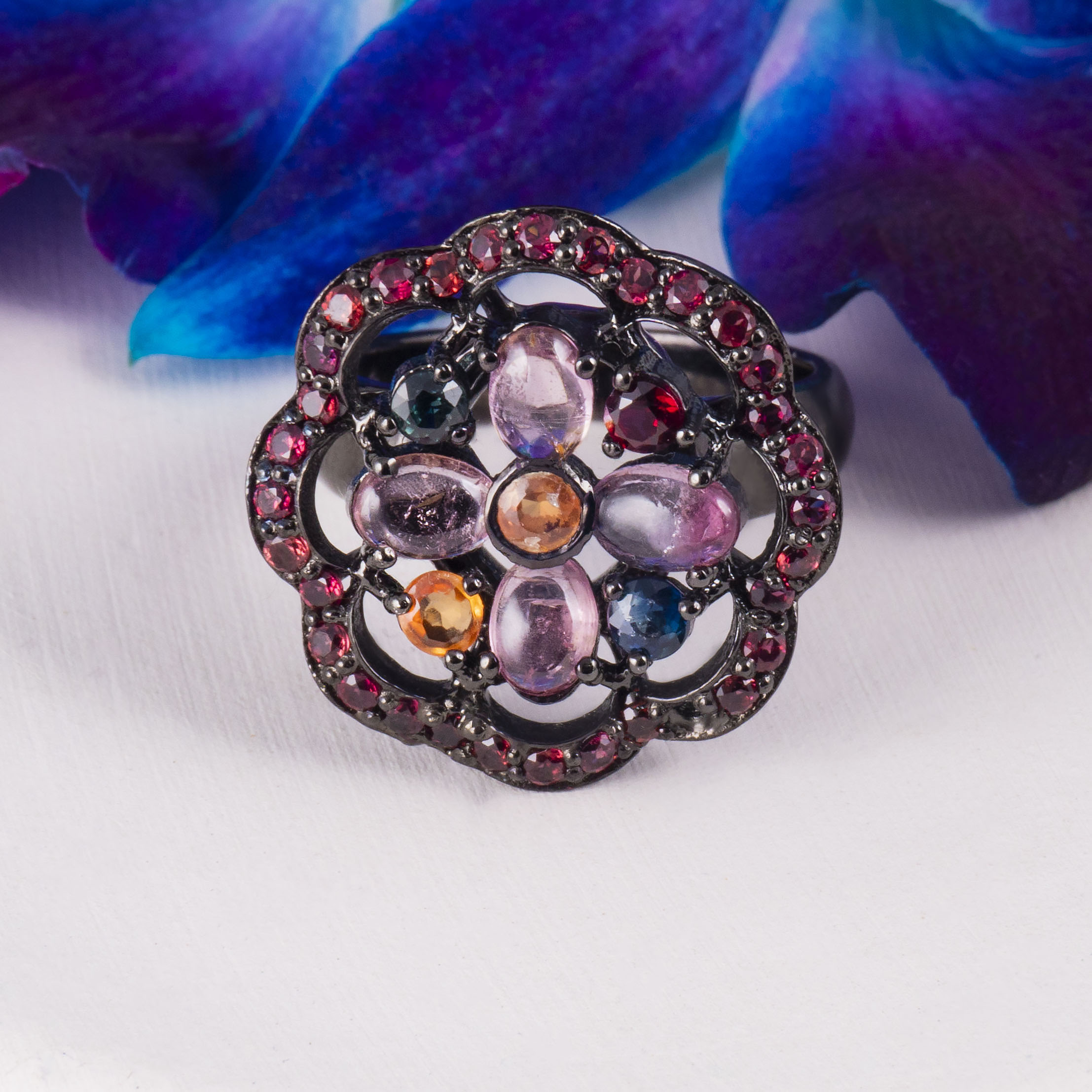 Кольцо из серебра с турмалином, сапфиром, родолитом