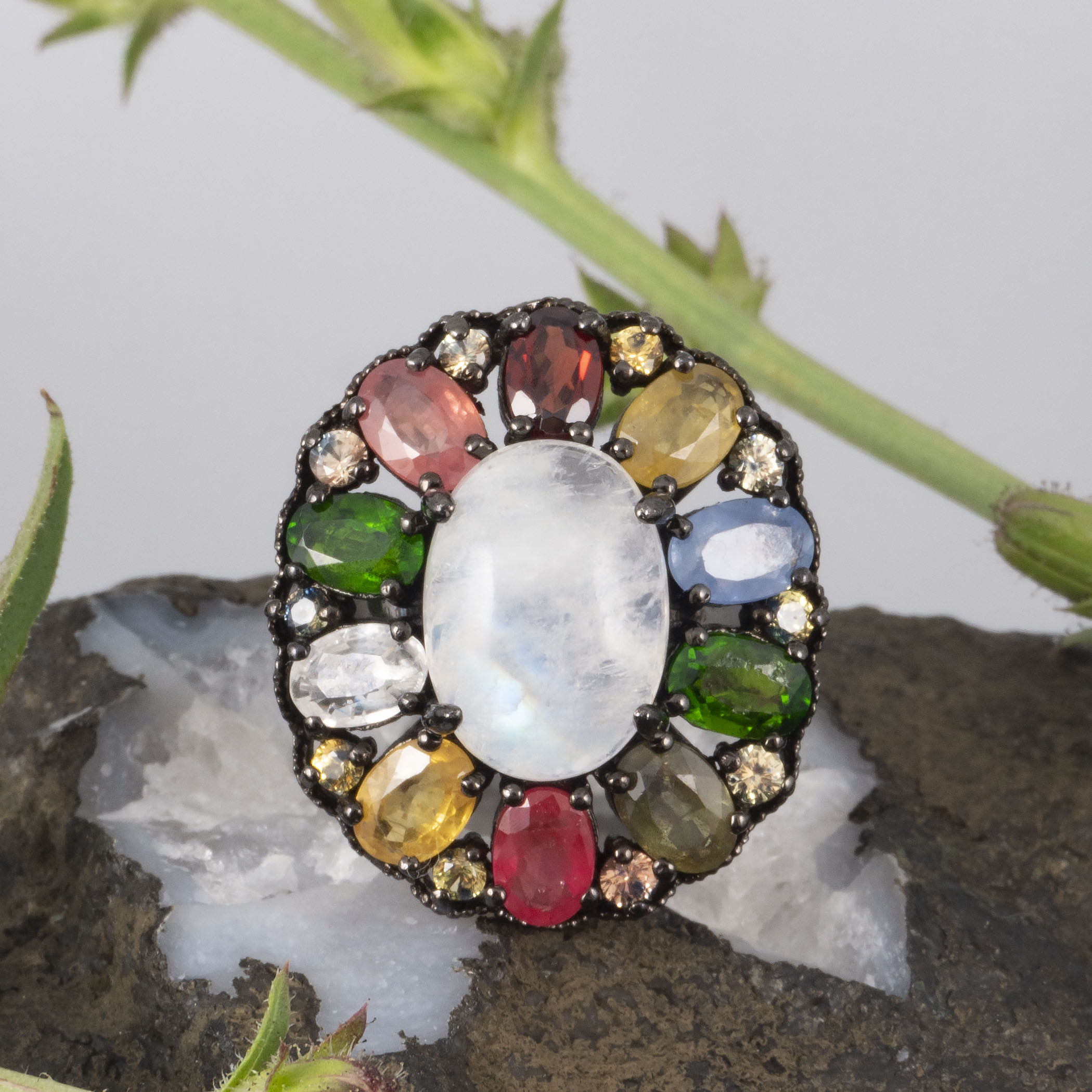 Кольцо из серебра с лунным камнем, сапфиром, гранатом, хромдиопсидом