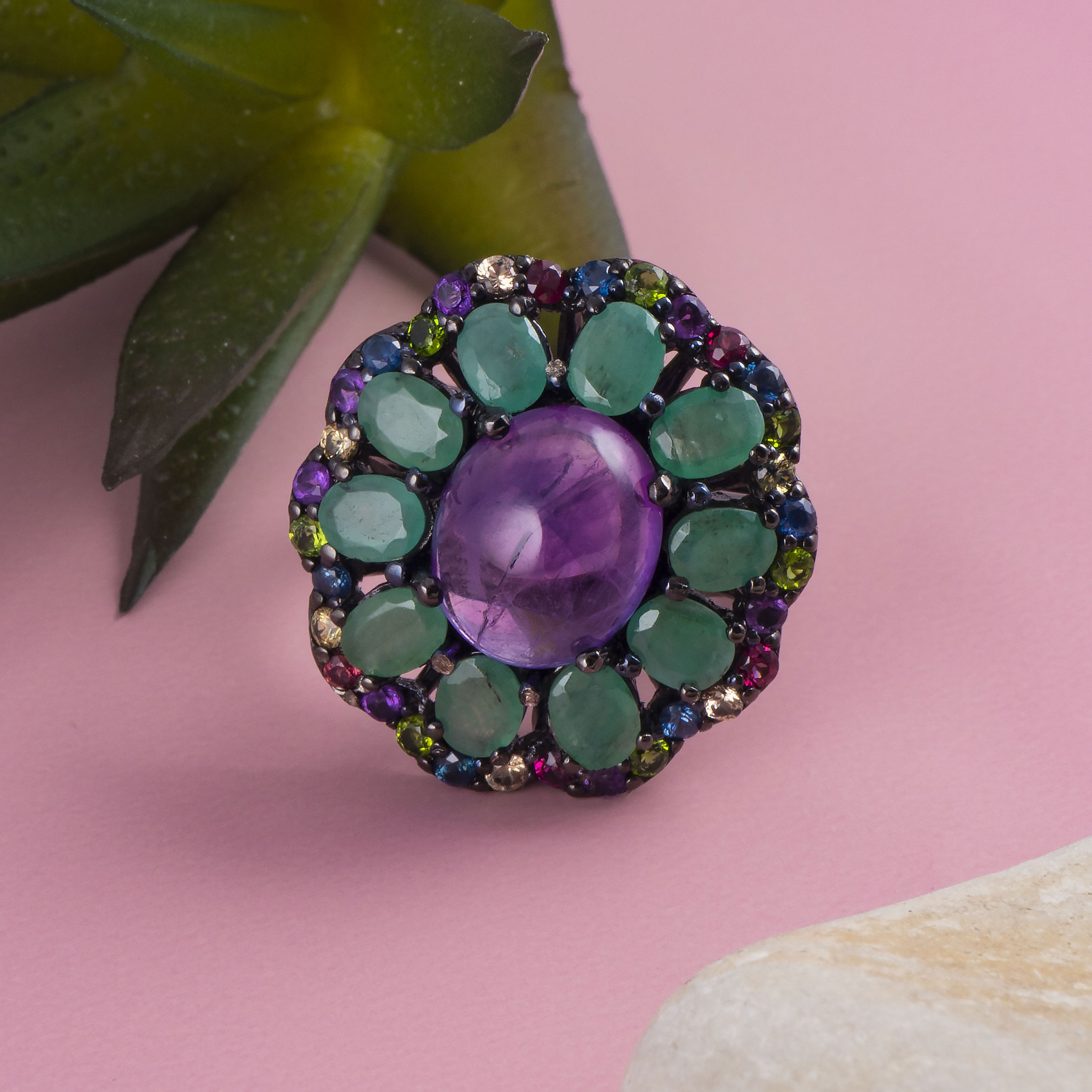Кольцо из серебра с изумрудом, сапфиром, аметистом