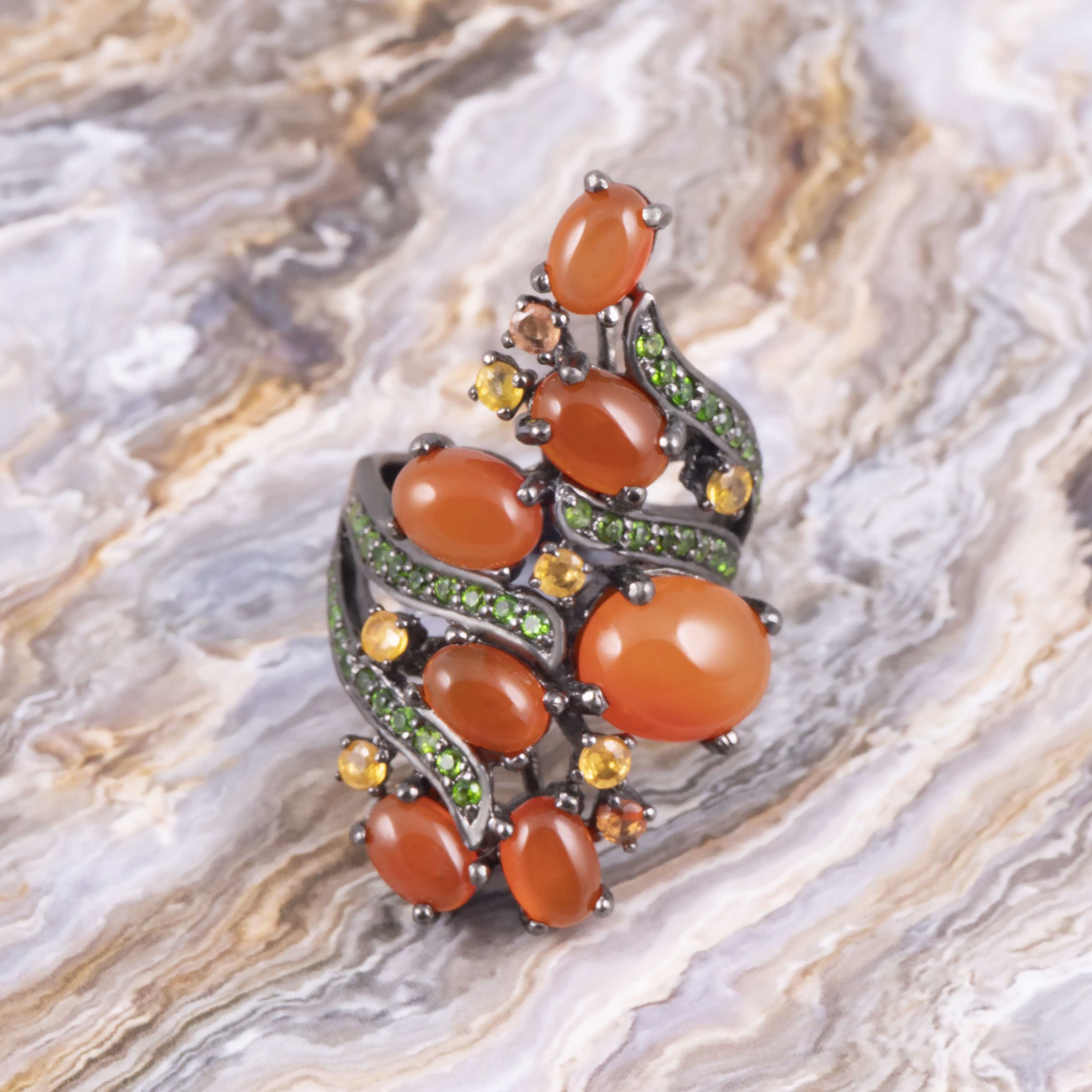 Кольцо из серебра с цитрином, сердоликом, хромдиопсидом