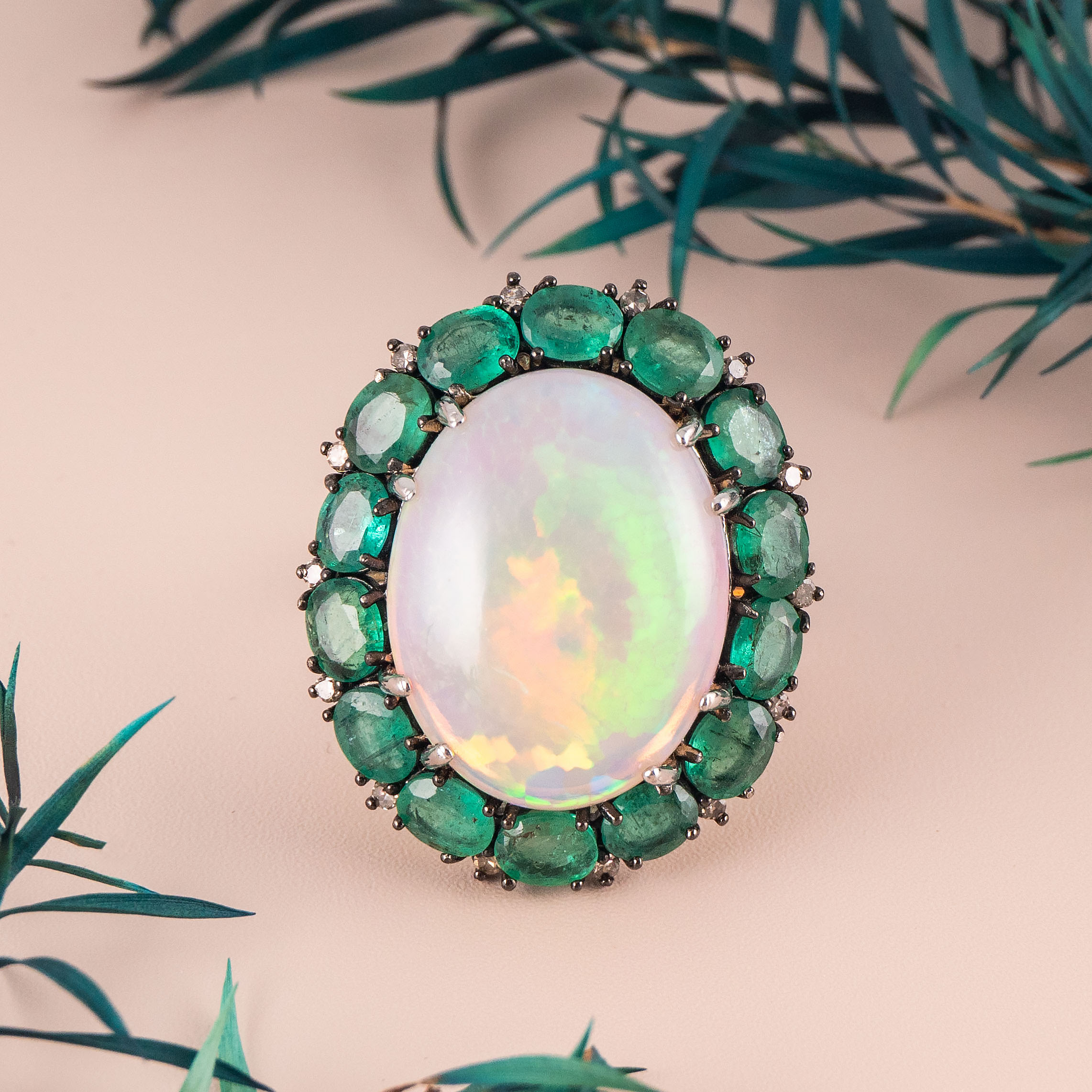 Кольцо из серебра с изумрудом, опалом, алмазом