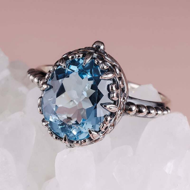 Топаз - один из самых популярных драгоценных камней в ювелирном искусстве. По твердости он уступает только алмазу и корунду. Прозрачность и бриллиантовый блеск граней делают его удивительно привлекательным для коллекционеров. Название камень получил в честь острова Топазос в Красном море. Люди знали этот камень еще в древние времена. Так, Библия гласит, что топаз составлял часть украшения первосвященника Аарона. Королевские дворы Европы также выбирали этот камень для ювелирных коллекций. Известен, например, камень “Браганза“, входящий в число регалий португальской короны. Цветовая гамма этого драгоценного камня разнообразна: существуют розовые, желтые, голубые, фиолетовые, винные топазы. Голубые топазы принято разделять на три категории в зависимости от интенсивности окраски (обычно достигаемой за счет облучения): Sky Blue - небесно-голубые, Swiss Blue - швейцарские, с более насыщенным цветом, и London Blue - лондонские, с наиболее глубоким оттенком синевы.