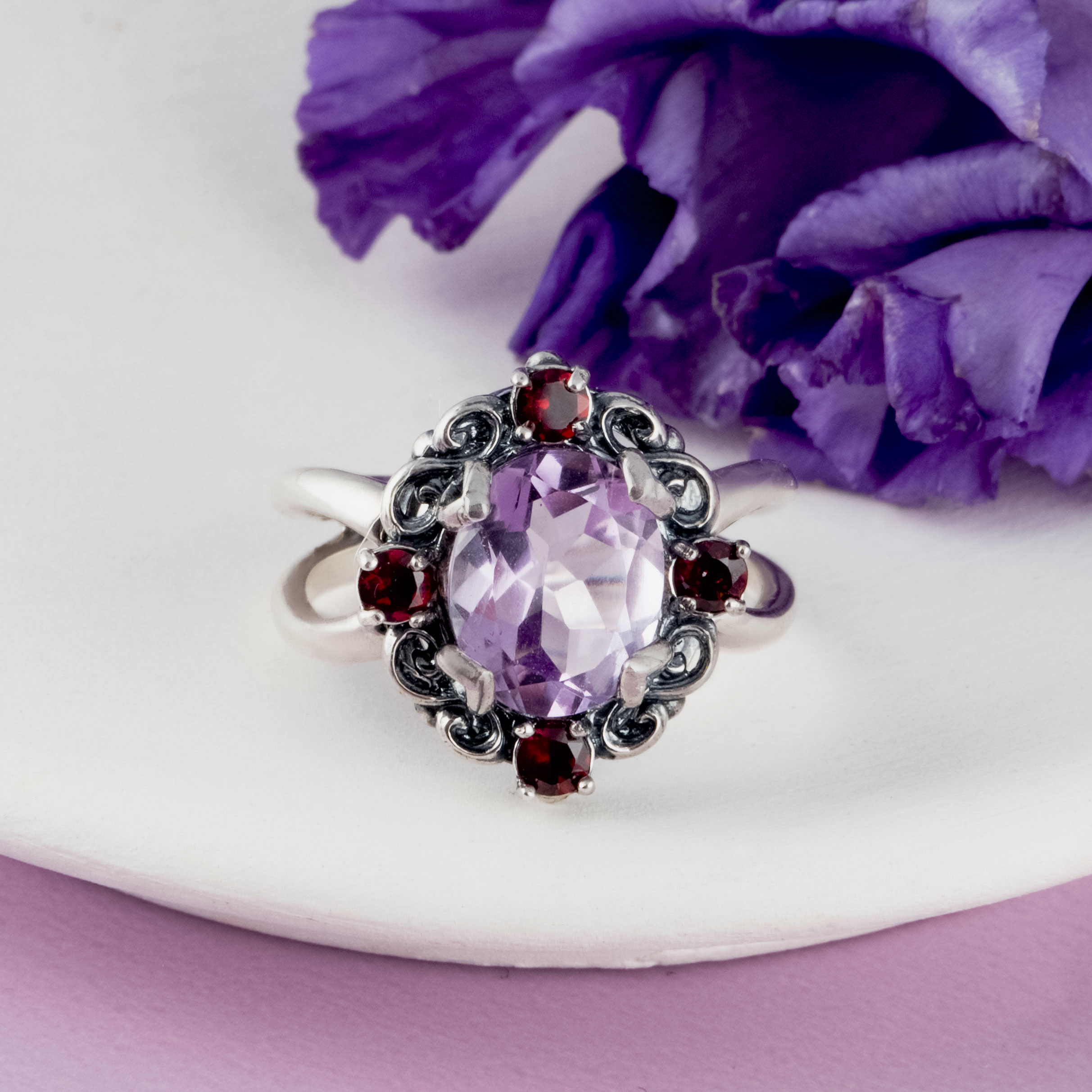 Кольцо из серебра с гранатом, аметистом