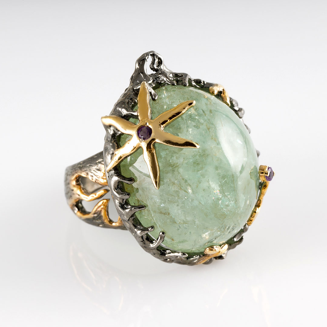 Аквамарин, как и изумруд, относится к бериллам. В переводе с латыни его название обозначает “морскую воду“, и действительно, изумительные оттенки океанической волны сделали его таким популярным среди ценителей ювелирных изделий. Как будто частичка прозрачной воды прибоя навсегда застыла и облеклась в этот поразительный камень. Главным источником аквамаринов всегда считалась Бразилия, но в России (в основном, в Забайкалье) также находят очень интересные экземпляры. Цвета их различаются от зеленовато-голубых до темно-зеленых. Аквамарины часто имеют очень интересные включения: в их глубине можно увидеть пузырьки газа в виде снежинок, звезд, и даже хризантем. Разглядывать такой внутренний мир можно бесконечно. Популярность этого камня увеличилась после того, как жена английского принца Гарри, Меган Маркл, на их свадьбе надела шикарное кольцо с аквамарином, принадлежавшее еще принцессе Диане. Отличный выбор для принцессы!