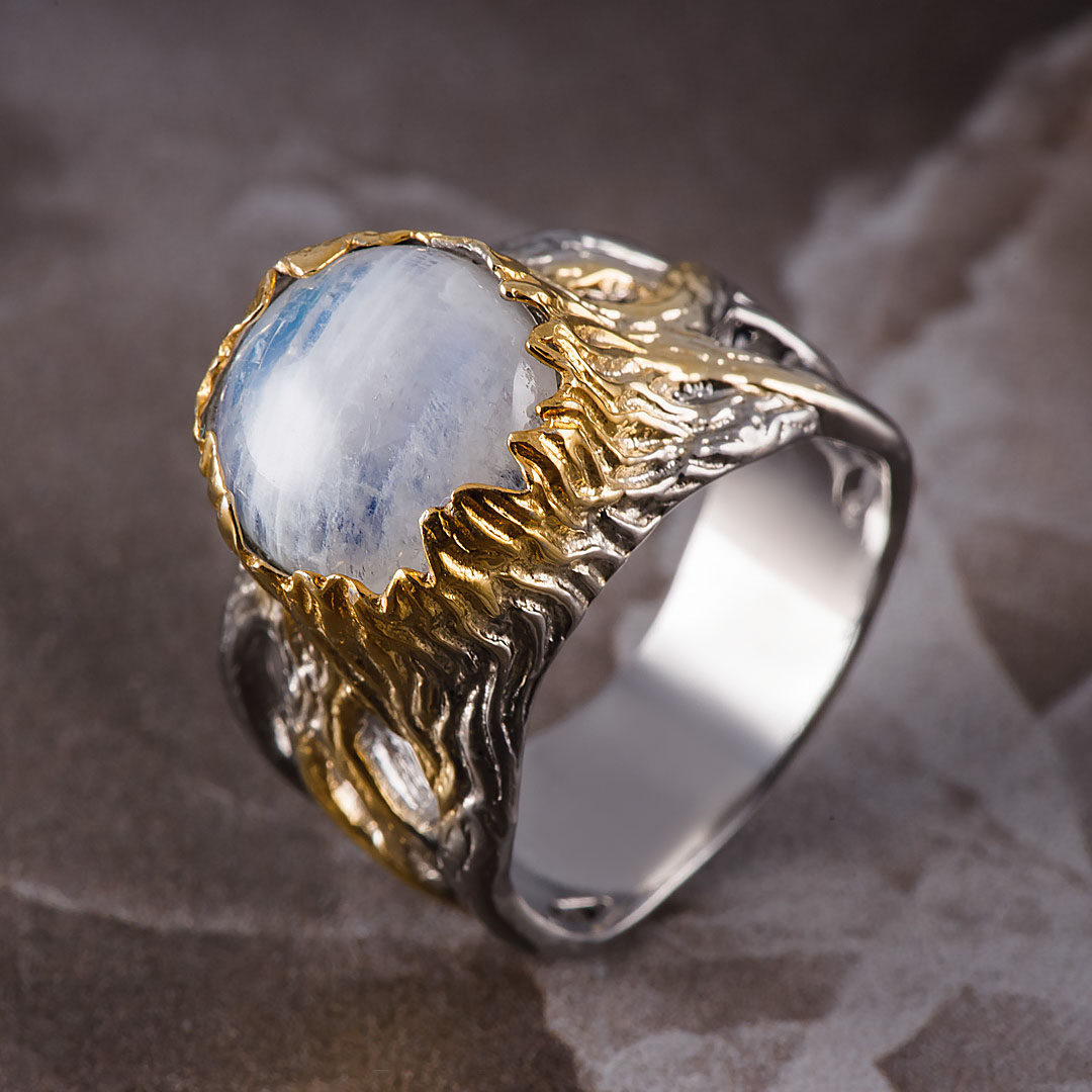 Кольцо из серебра с лунным камнем, цитрином, аметистом, хромдиопсидом
