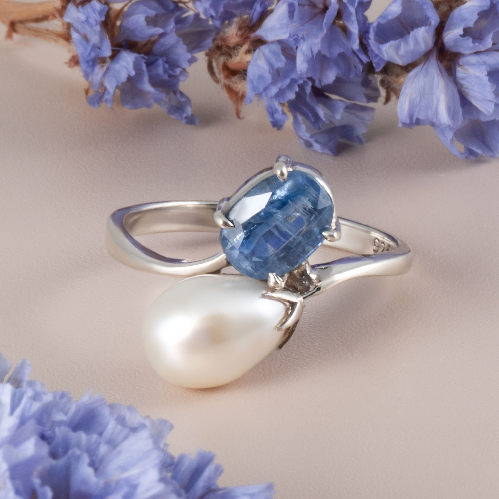 Кольцо из серебра с кианитом, жемчугом