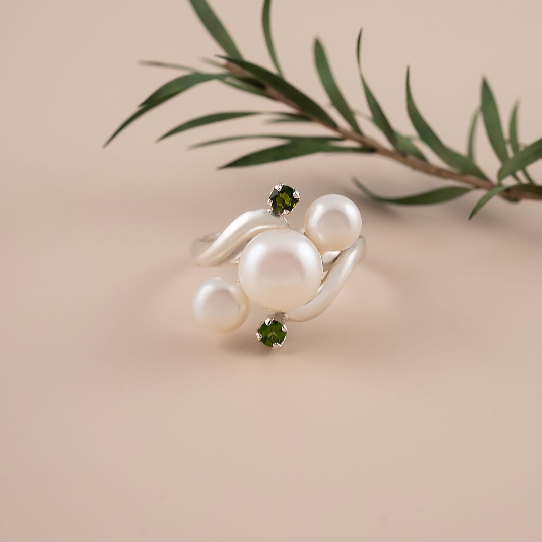 Кольцо из серебра с жемчугом, хромдиопсидом