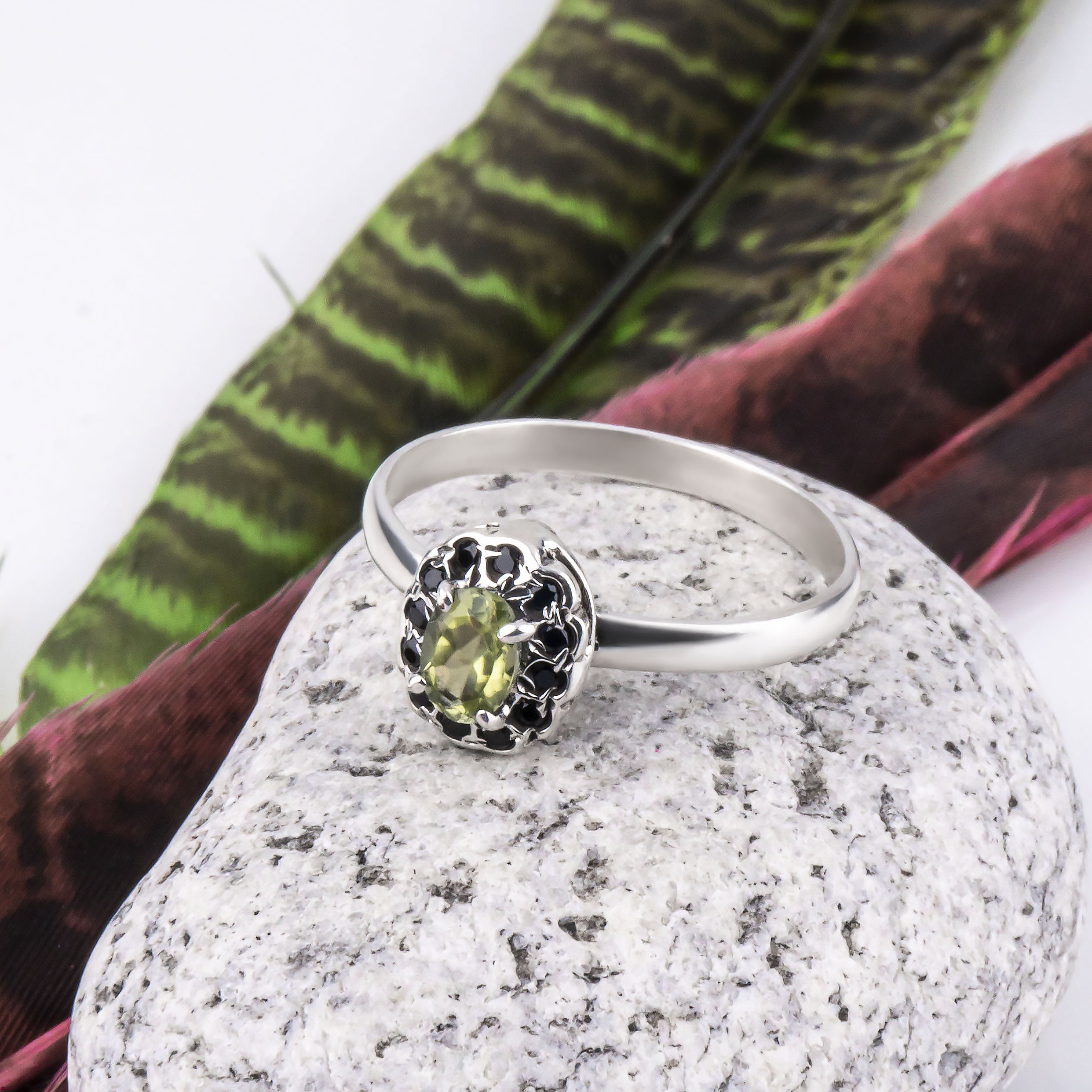Кольцо из серебра с ониксом, хризолитом