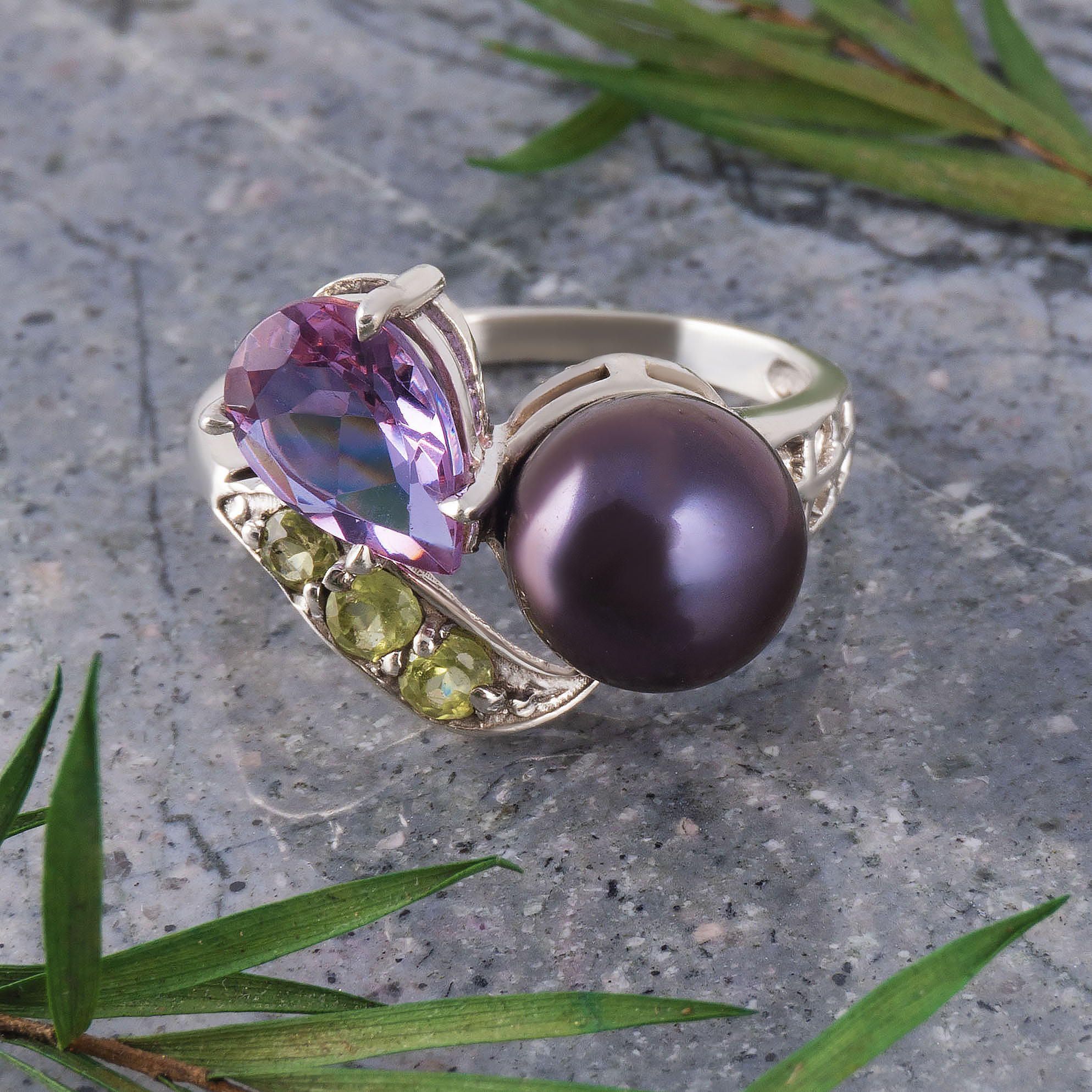 Кольцо из серебра с хризолитом, жемчугом, аметистом