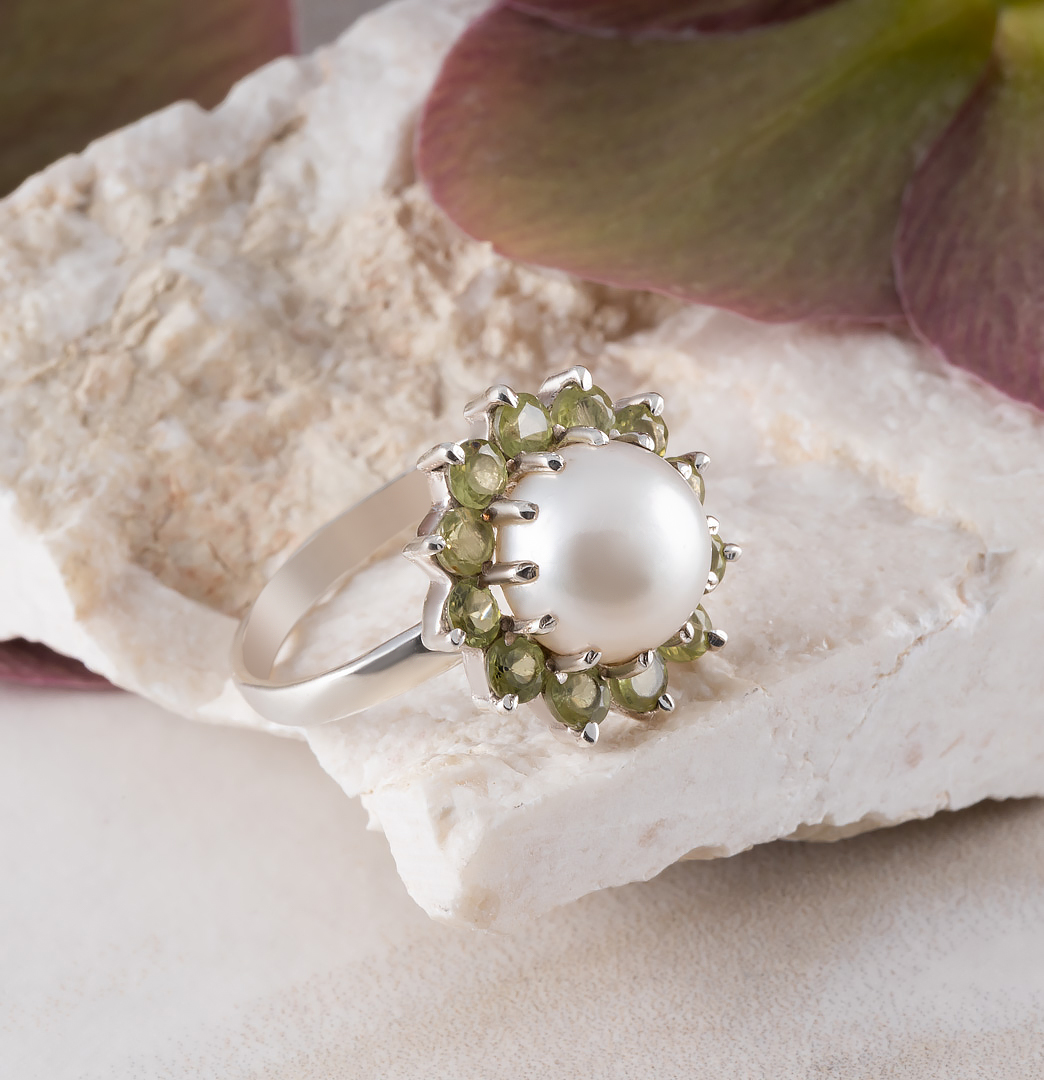 Кольцо из серебра с хризолитом, жемчугом