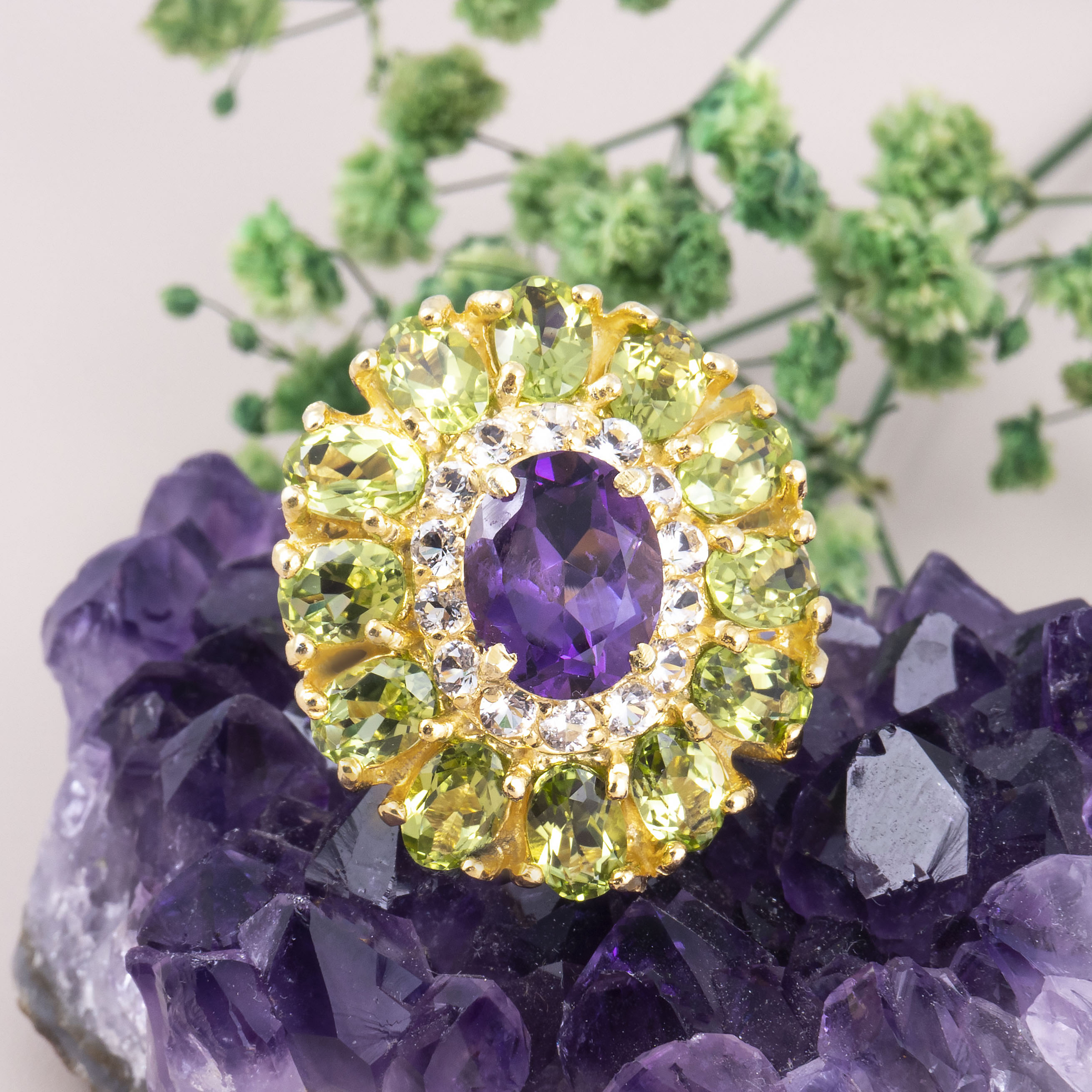 Кольцо из серебра с хризолитом, аметистом, фианитом