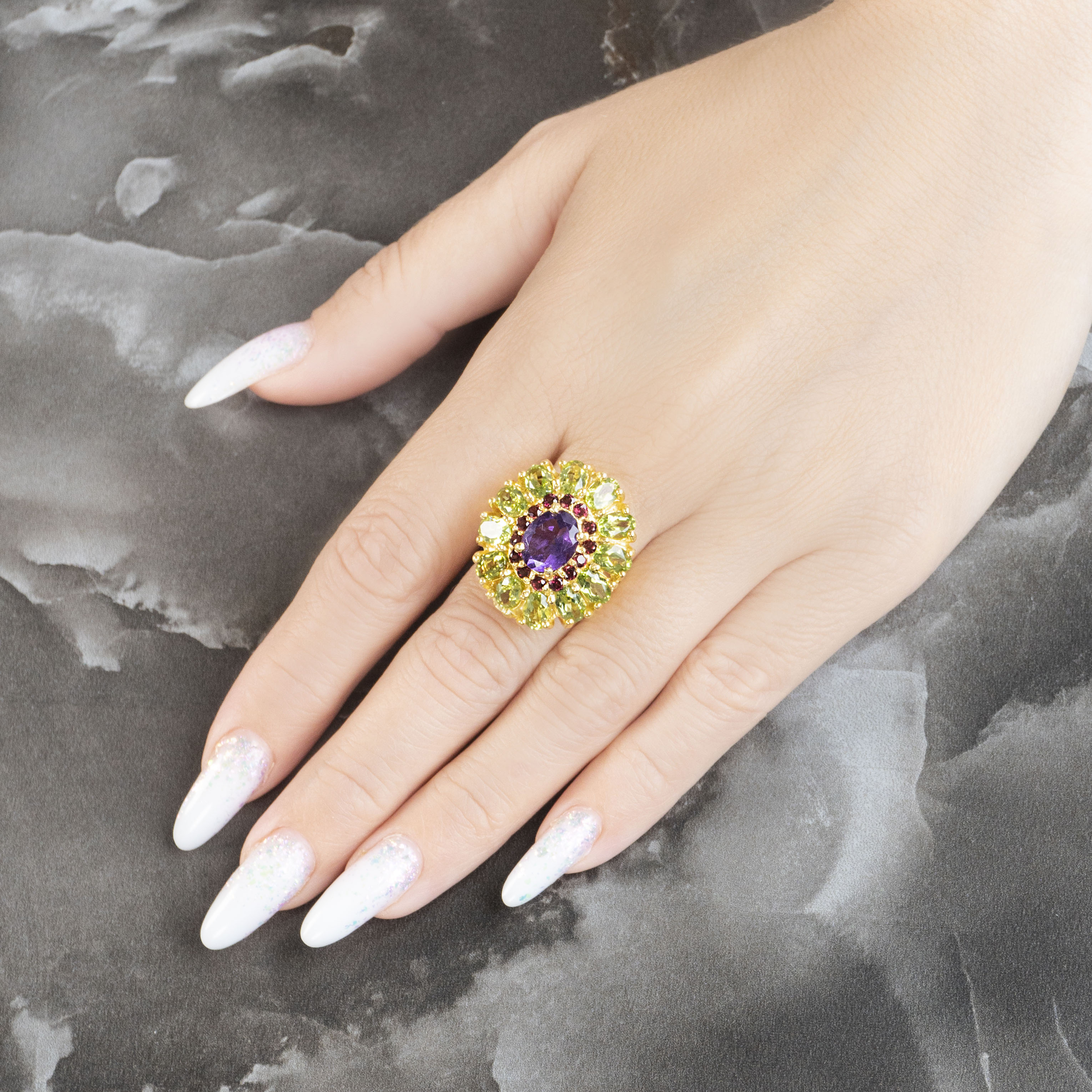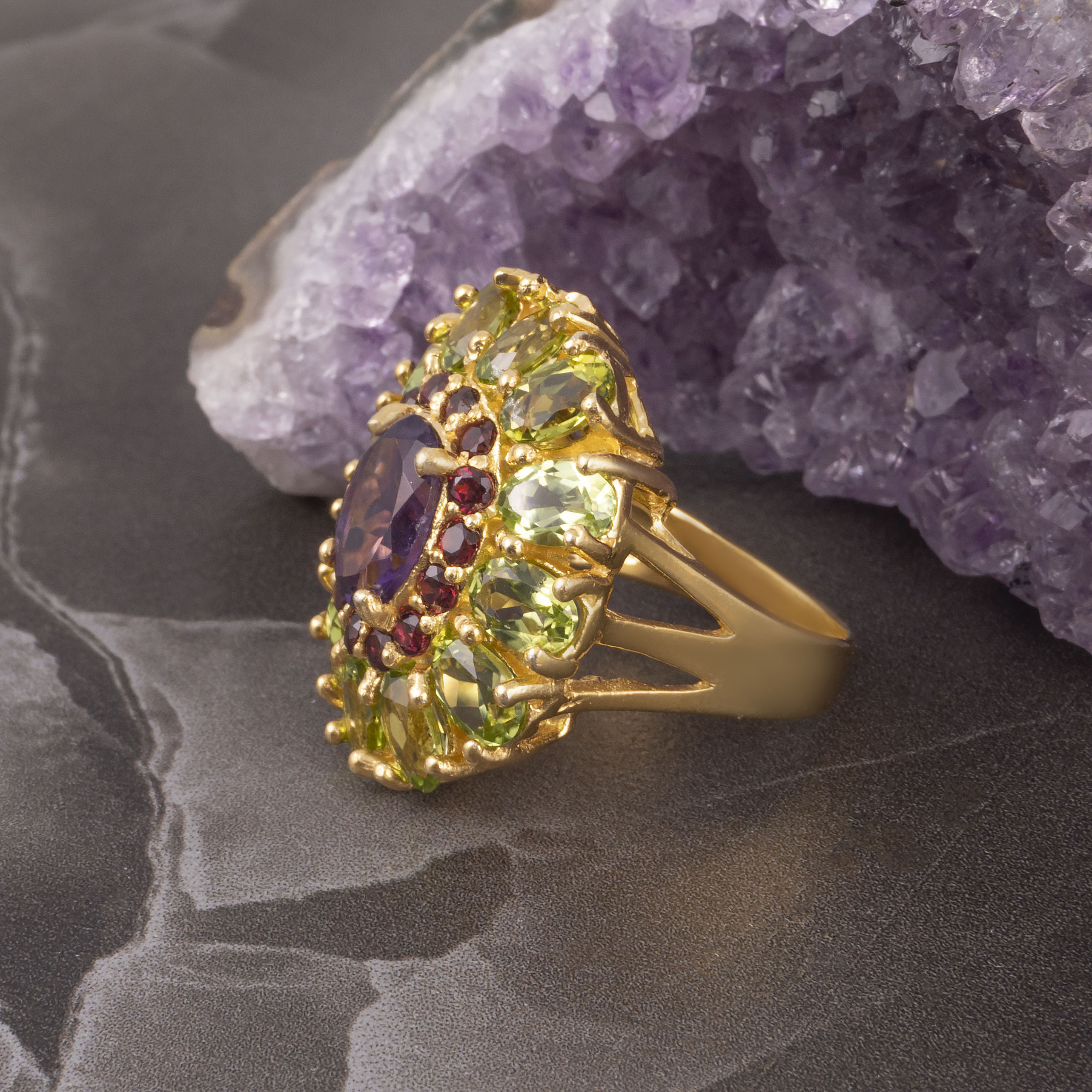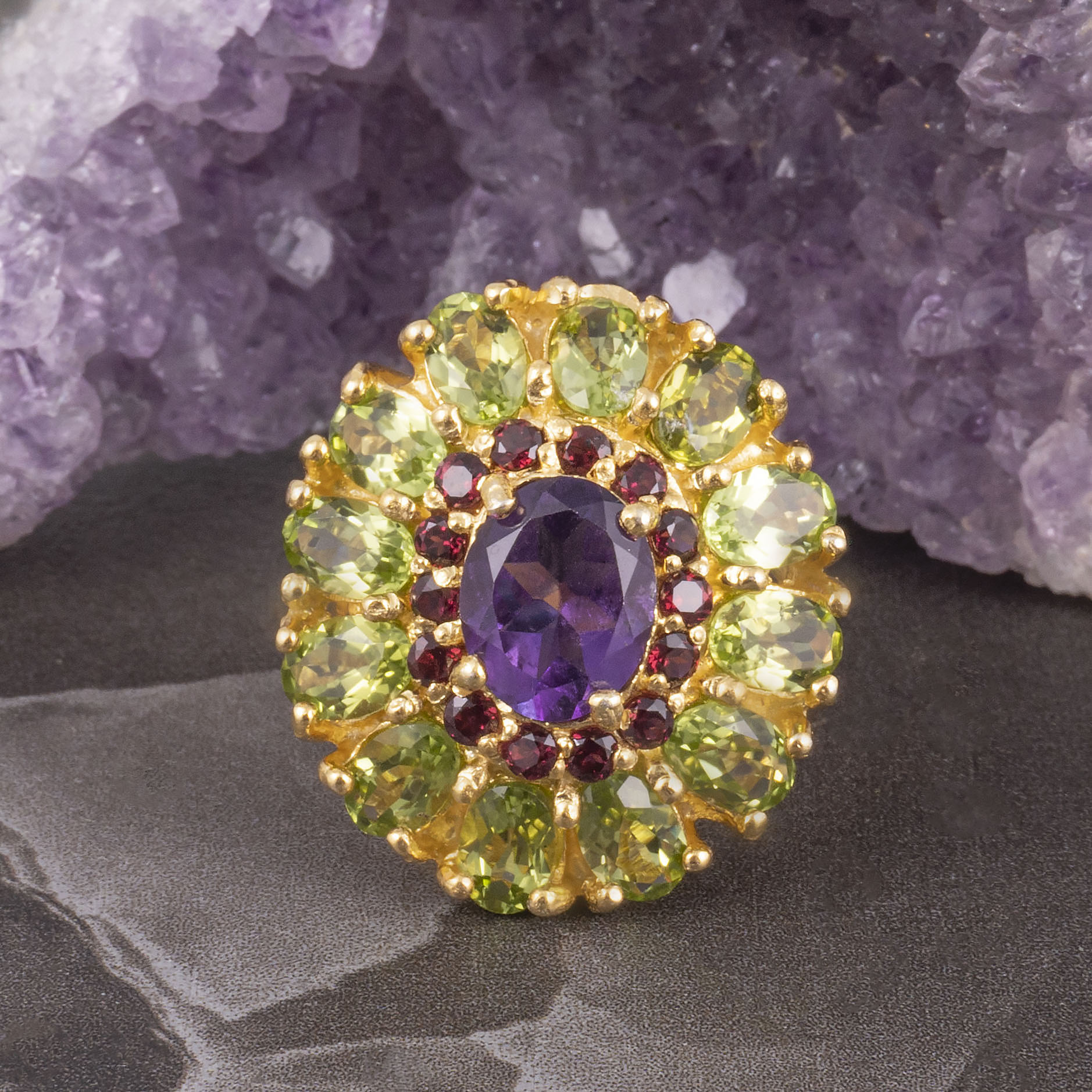 Кольцо из серебра с хризолитом, аметистом, родолитом
