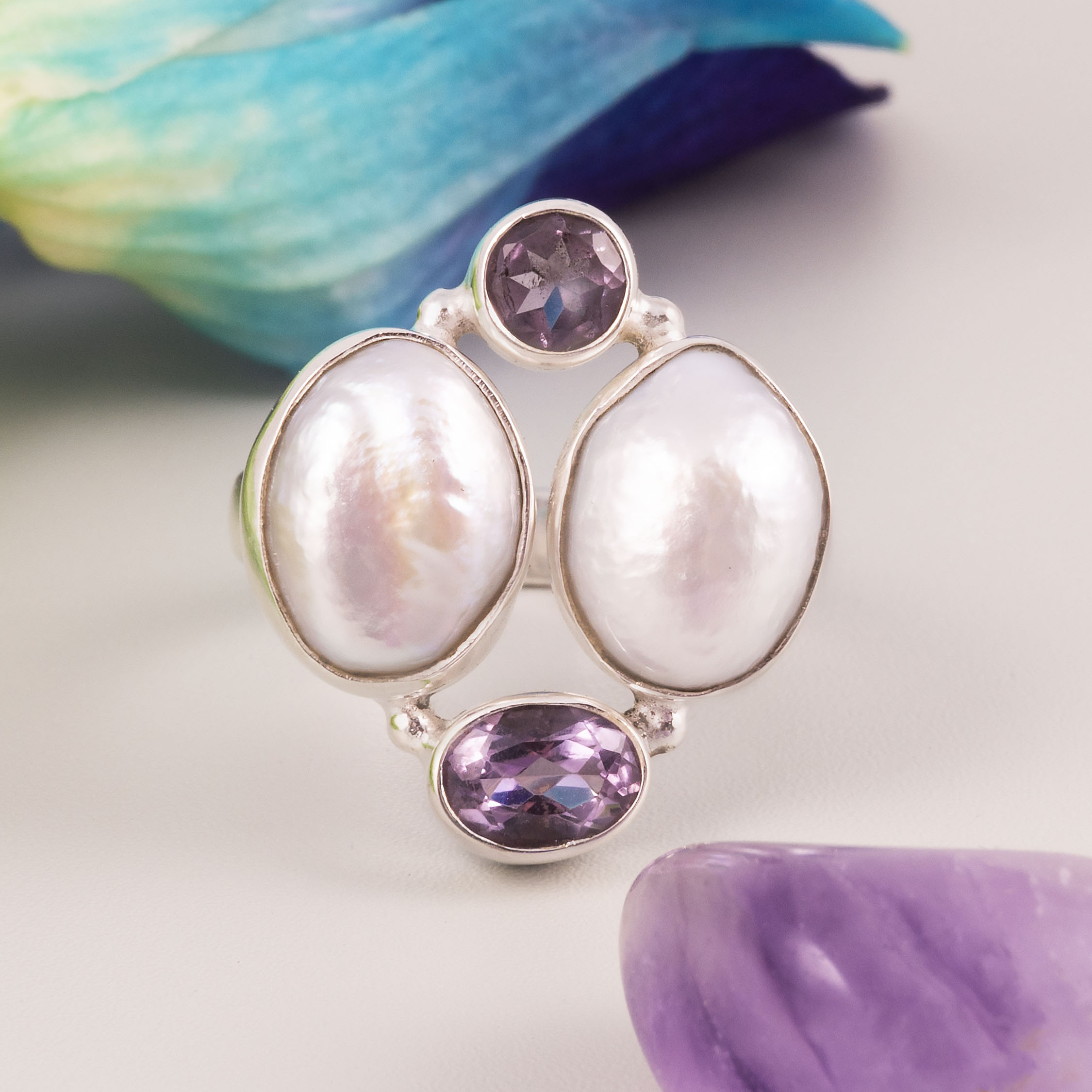 Кольцо из серебра с жемчугом, аметистом