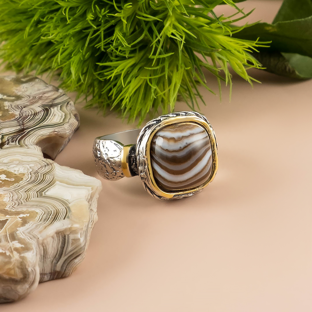 Агат - разновидность халцедона, имеющий красивую слоистую окраску. Формирование этого камня проходит в жеодах - природных пустотах, а слои часто вырастают вокруг них, повторяя своими очертаниями форму жеода. Название камня произошло от реки Ахатес на Сицилии, где происходила их добыча. По другой версии, агат получил название от греческого “ahates“ - “счастливый“. Каждый агат имеет неповторимый рисунок - целые пейзажи и картины, которые можно рассматривать бесконечно. В зависимости от того, увидите ли Вы в камне звездное небо или плывущие облака, агаты называют “пейзажными“, “звездчатыми“, “облачными“.