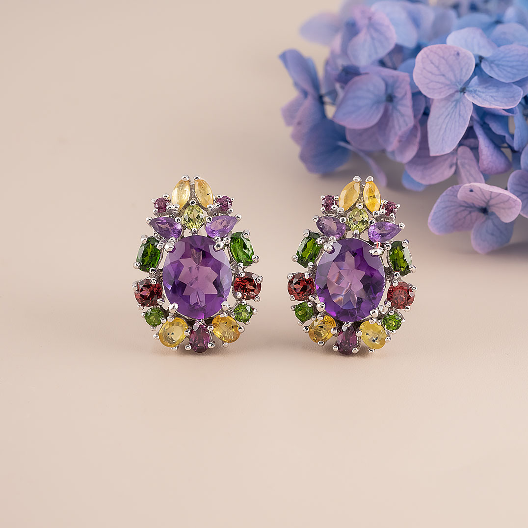 Серьги из серебра с цитрином, хризолитом, аметистом, родолитом, хромдиопсидом