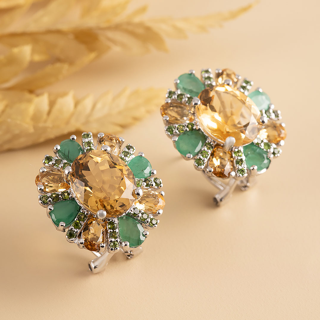 Серьги из серебра с цитрином, изумрудом, хромдиопсидом