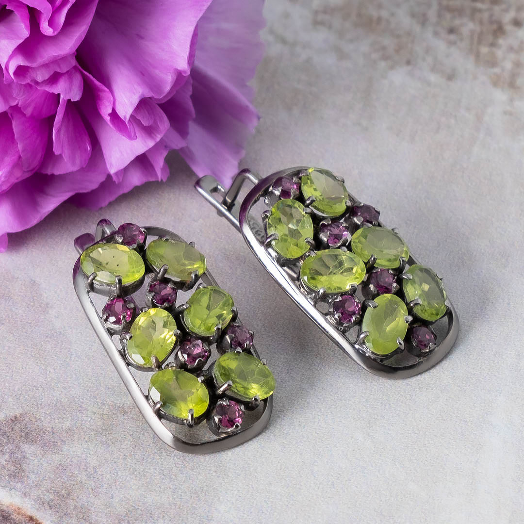 Серьги из серебра с хризолитом, родолитом