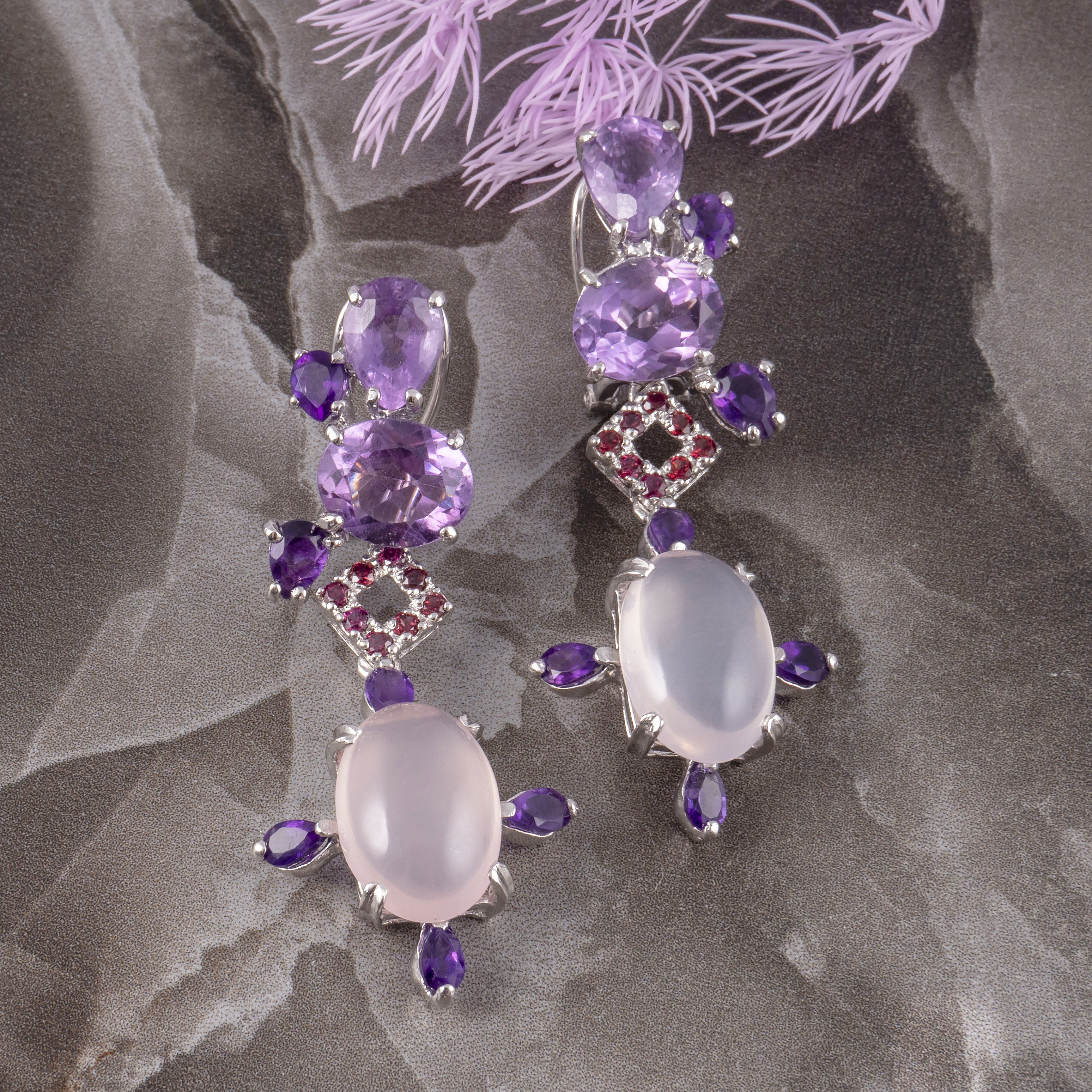 Серьги из серебра с аметистом, родолитом, розовым кварцем
