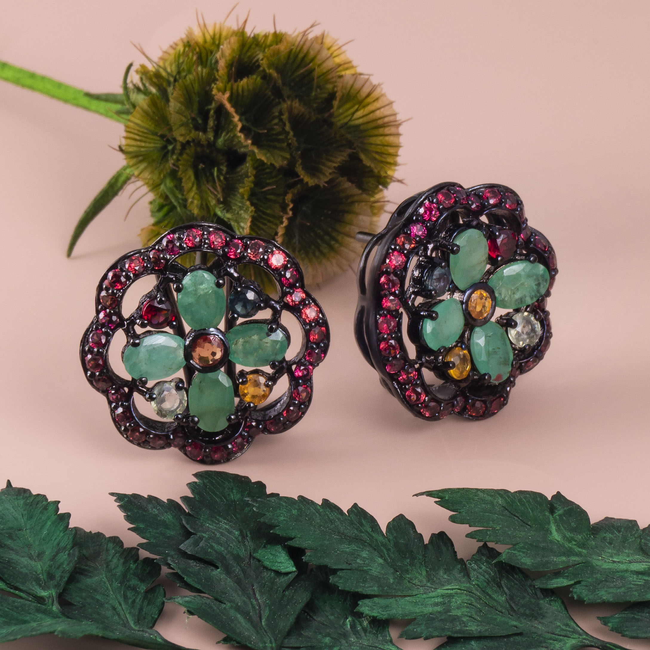 Серьги из серебра с изумрудом, сапфиром, родолитом