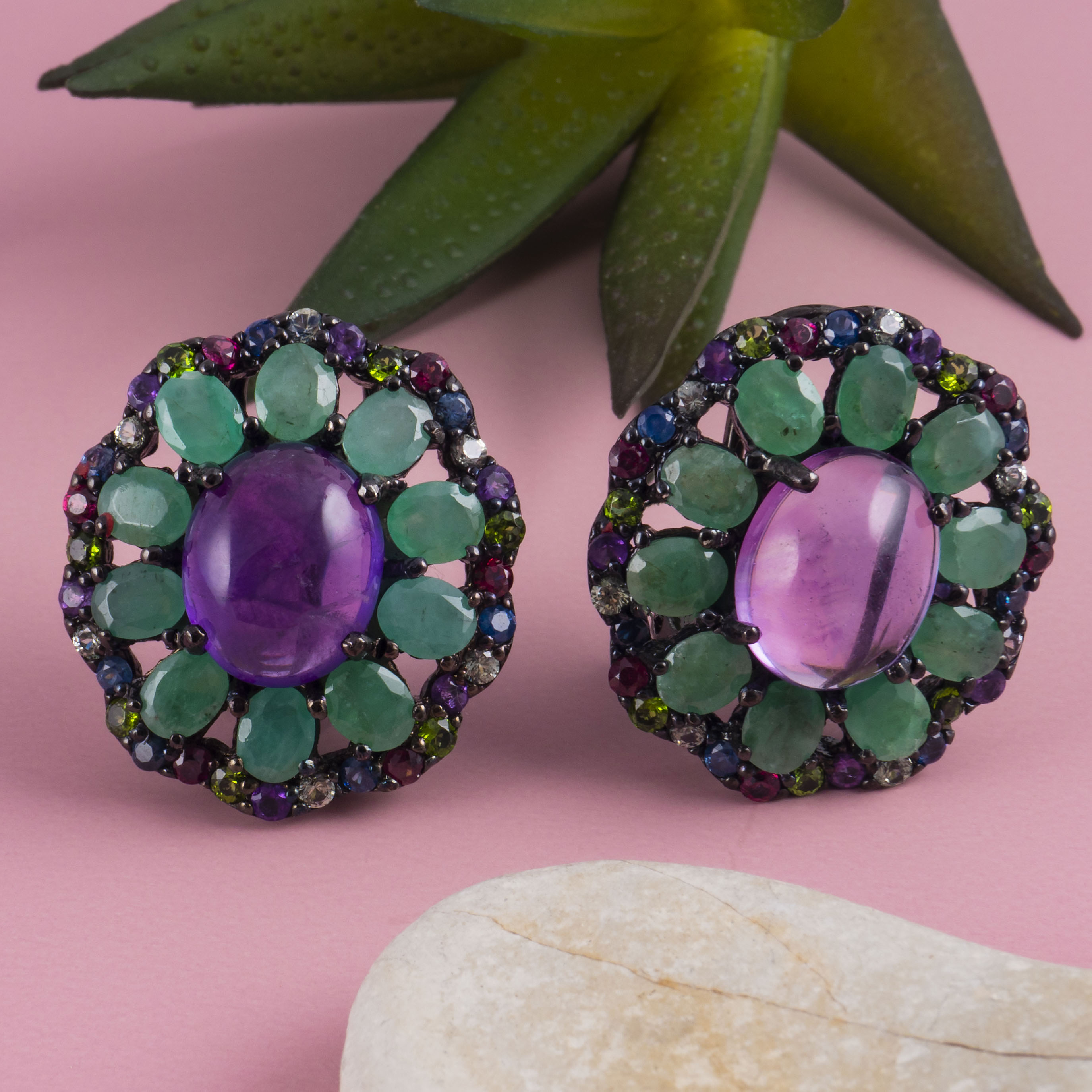 Серьги из серебра с изумрудом, сапфиром, аметистом
