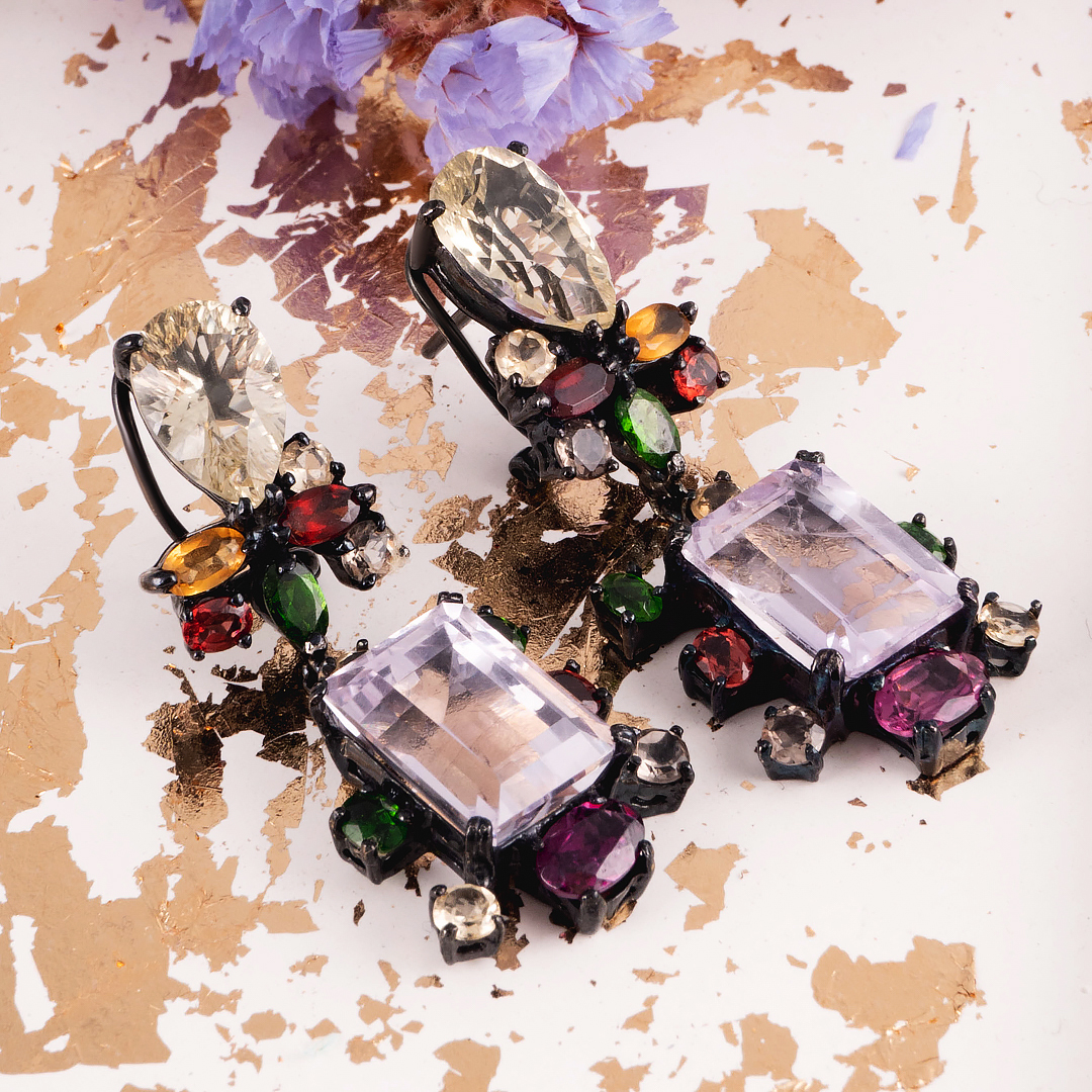 Серьги из серебра с цитрином, гранатом, аметистом, родолитом, хромдиопсидом