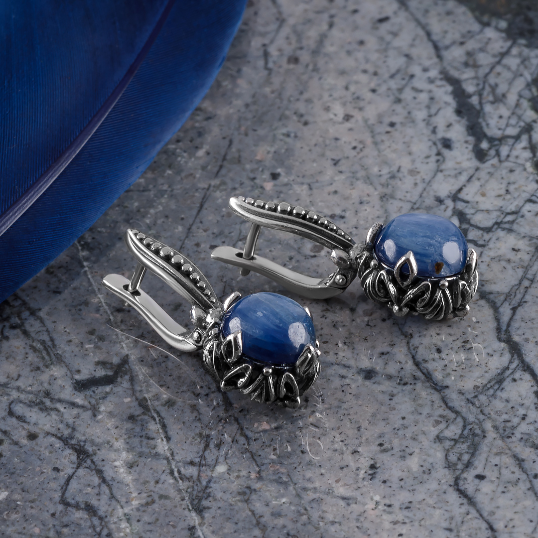 Кианит привлекает своим насыщенным цветом и необычной “слоистой“ структурой, делающей его похожим на леденец. Название произошло от греческого “kyanos“ - “синий“, и действительно, чаще всего этот камень радует глаз всеми оттенками океанической волны: от глубокой синевы до нежной лазури. Прозрачные кианиты поэтому можно принять за сапфиры. Однако, встречаются и желтые, и зеленые, похожие на изумруды, камни. Особенно красив кианит в серебре - глубокий синий цвет отлично гармонирует с холодностью белого металла.