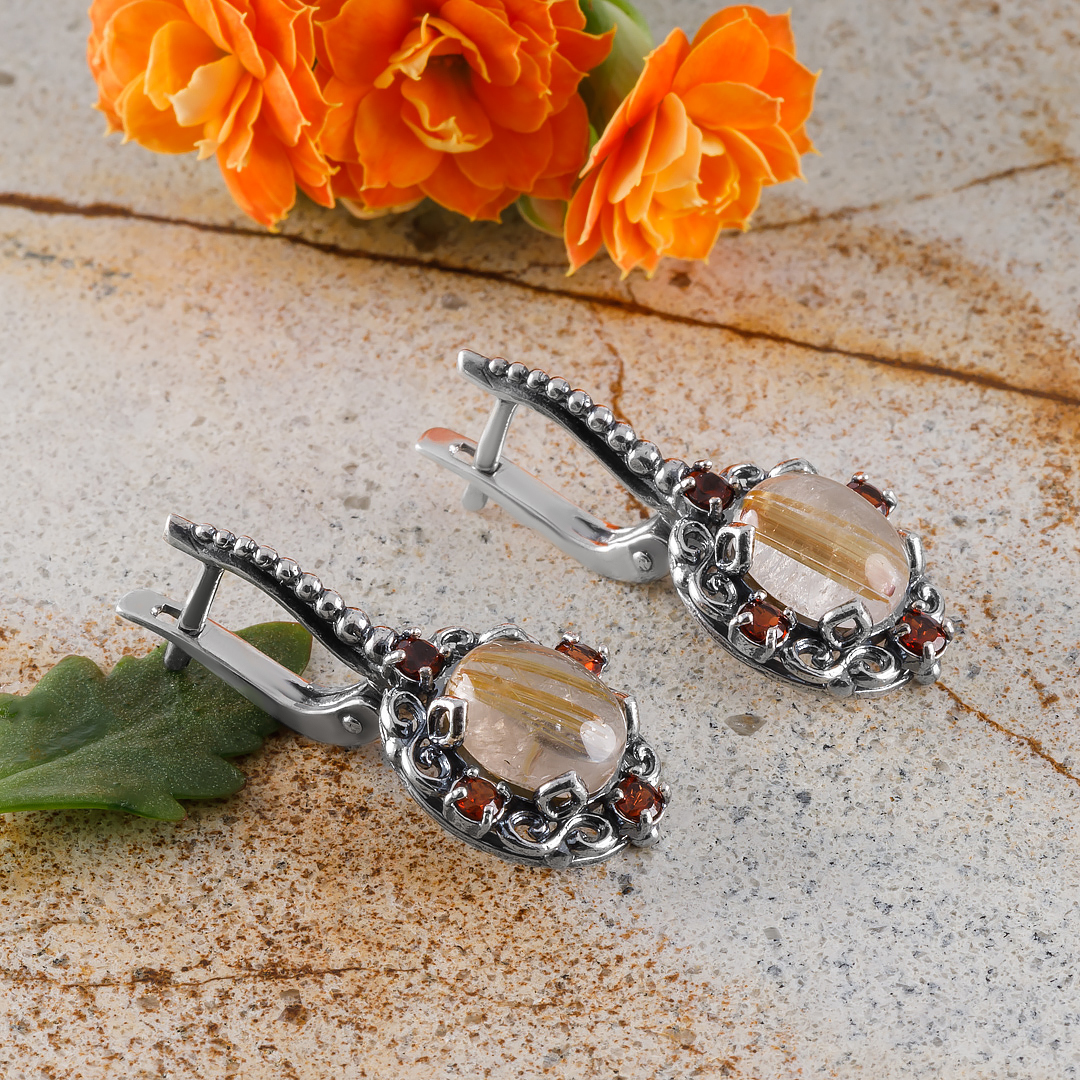 Серьги из серебра с гранатом, рутиловым кварцем (волосатик)