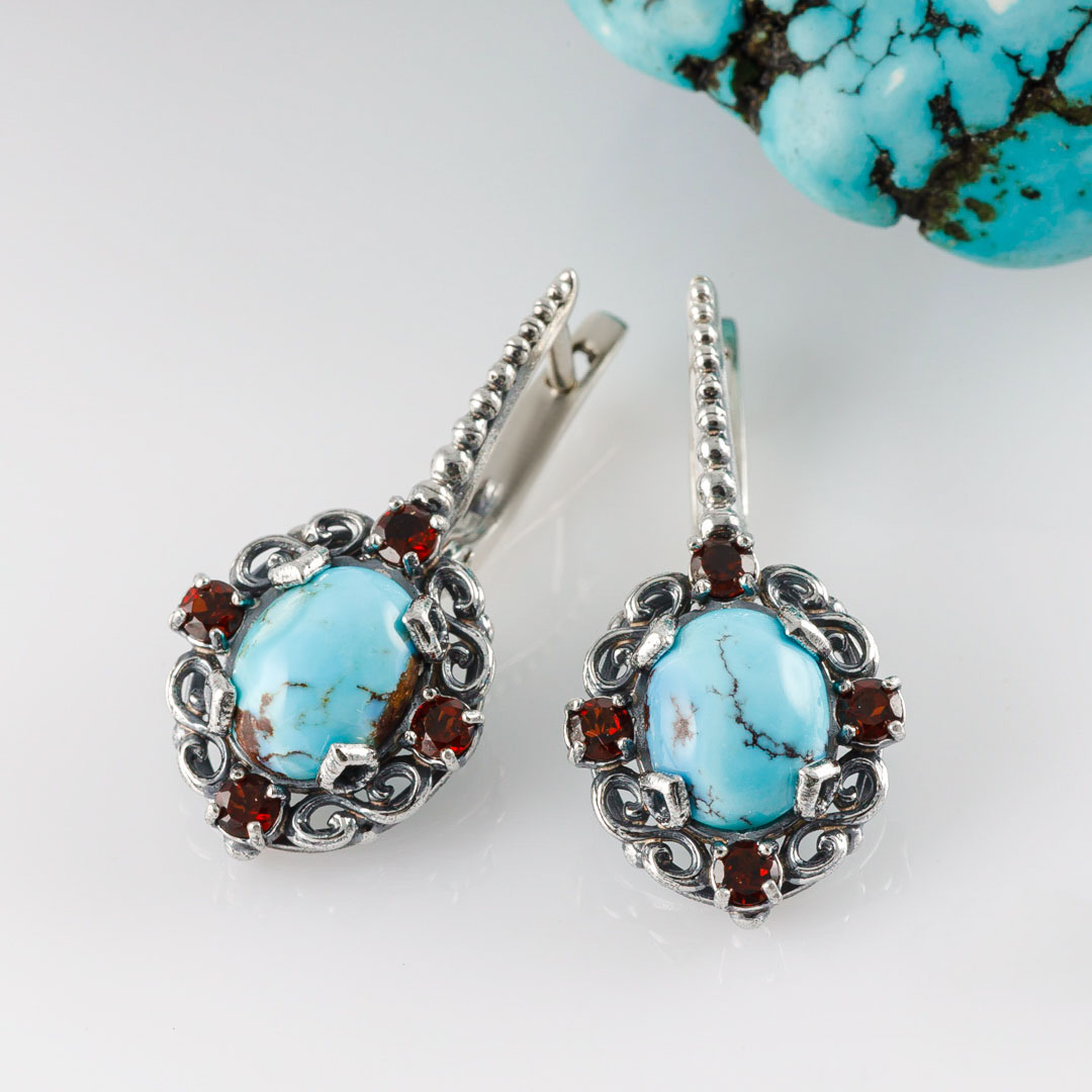 Серьги из серебра с гранатом, бирюзой