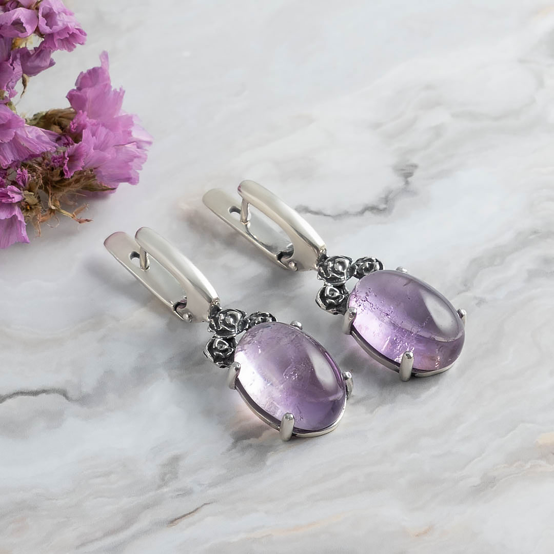 Серьги из серебра с лунным камнем, аметистом