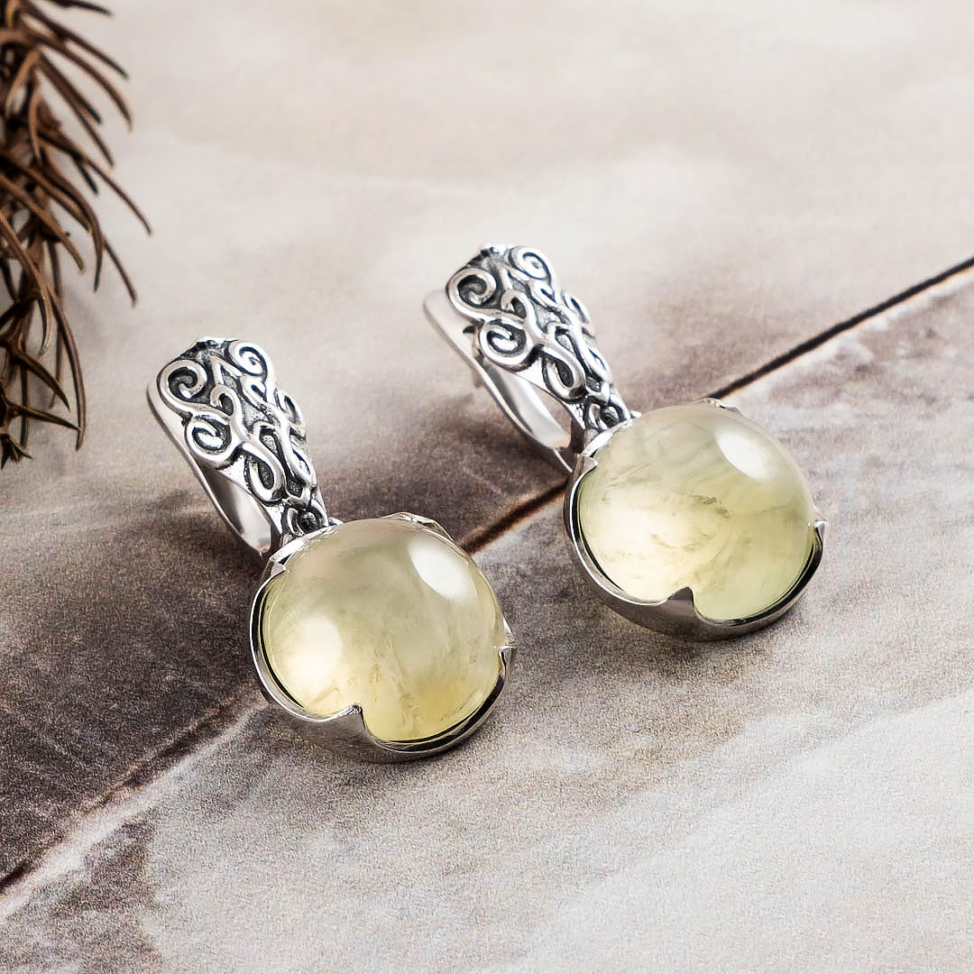 Серьги из серебра с хризолитом, пренитом