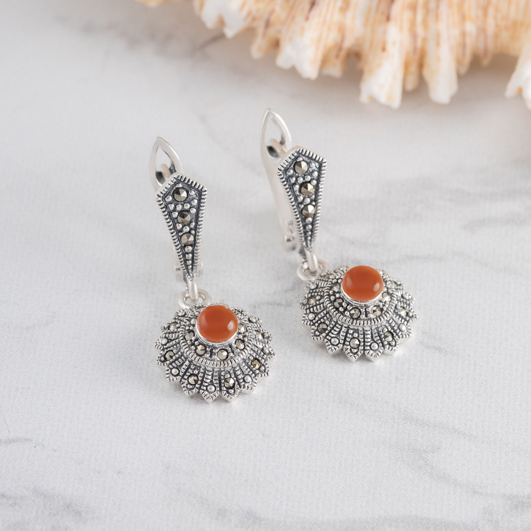 Серьги из серебра с марказитом, сердоликом