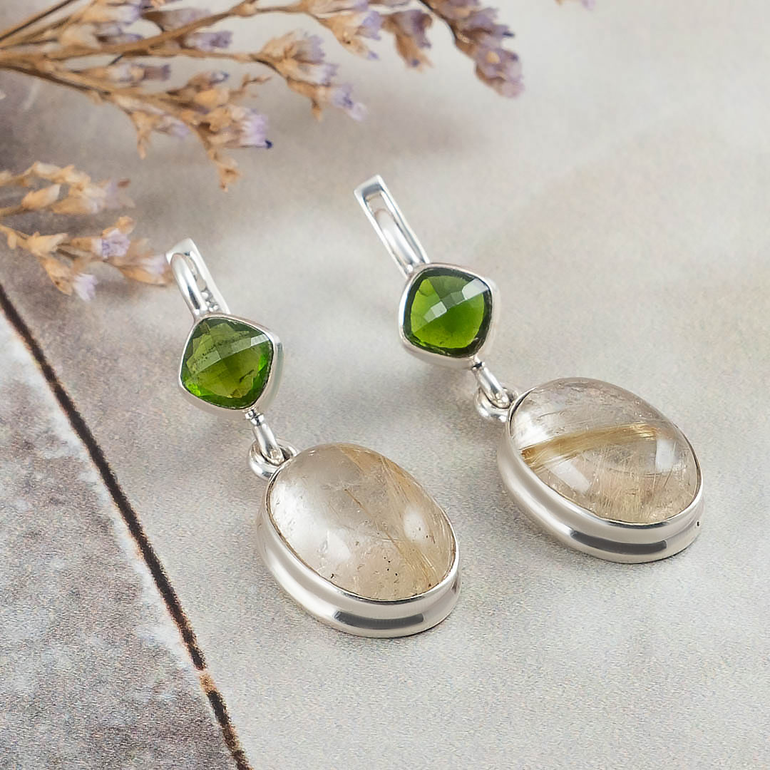 Серьги из серебра с рутиловым кварцем (волосатик), хромдиопсидом